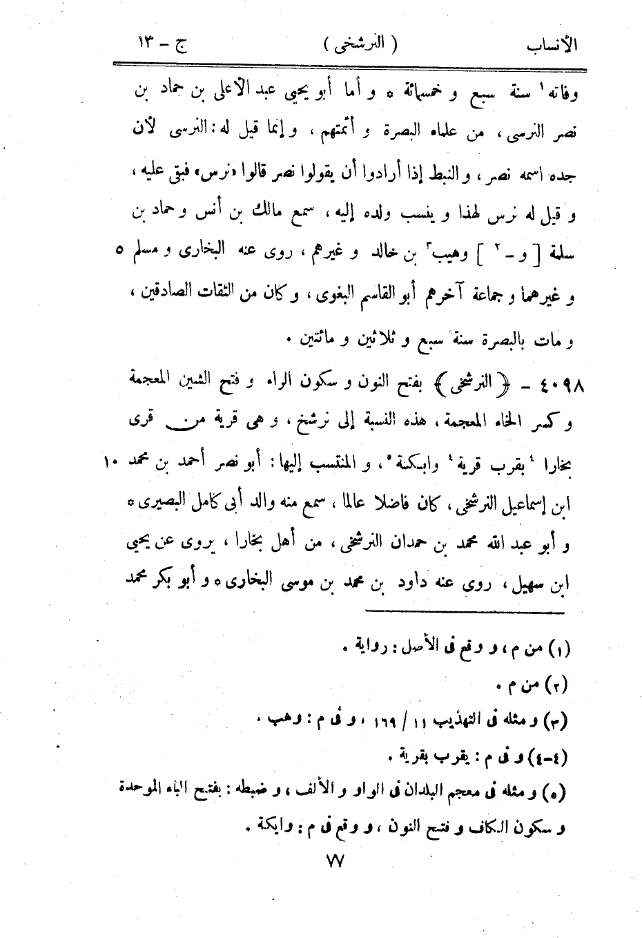 بفتح النون وسكون الراء وفتح الشين المعجمة وكسر الخاء المعجمة، هذه النسبة إلى نرشخ، وهي قرية من قرى بخارا [4] بقرب قرية [4] وابكة [5] ، والمنتسب إليها: أبو نصر أحمد بن محمد ابن إسماعيل النرشخى، كان فاضلا عالما، سمع منه والد أبى كامل البصيري وأبو عبد الله محمد بن حمدان النرشخى، من أهل بخارا، يروى عن يحيى ابن سهيل، روى عنه داود بن محمد بن موسى البخاري وأبو بكر محمد