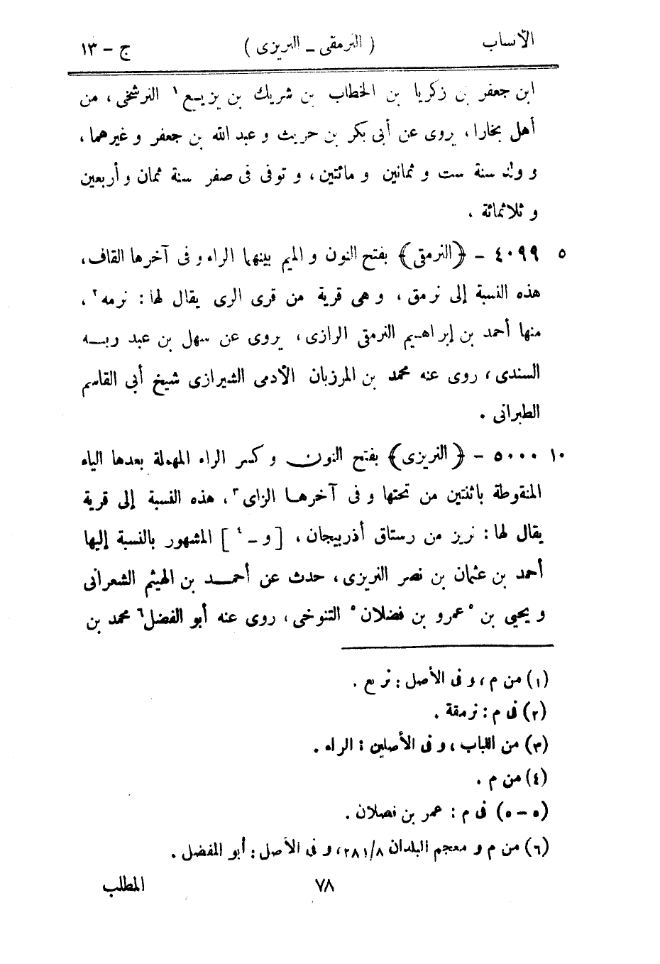 بفتح النون وكسر الراء المهملة بعدها الياء المنقوطة باثنتين من تحتها وفي آخرها الزاى [3] ، هذه النسبة إلى قرية يقال لها: نريز من رستاق أذربيجان، [و-[4]] المشهور بالنسبة إليها أحمد بن عثمان بن نصر النريزى، حدث عن أحمد بن الهيثم الشعراني ويحيى بن [5] عمرو بن فضلان [5] التنوخي، روى عنه أبو الفضل [6] محمد بن