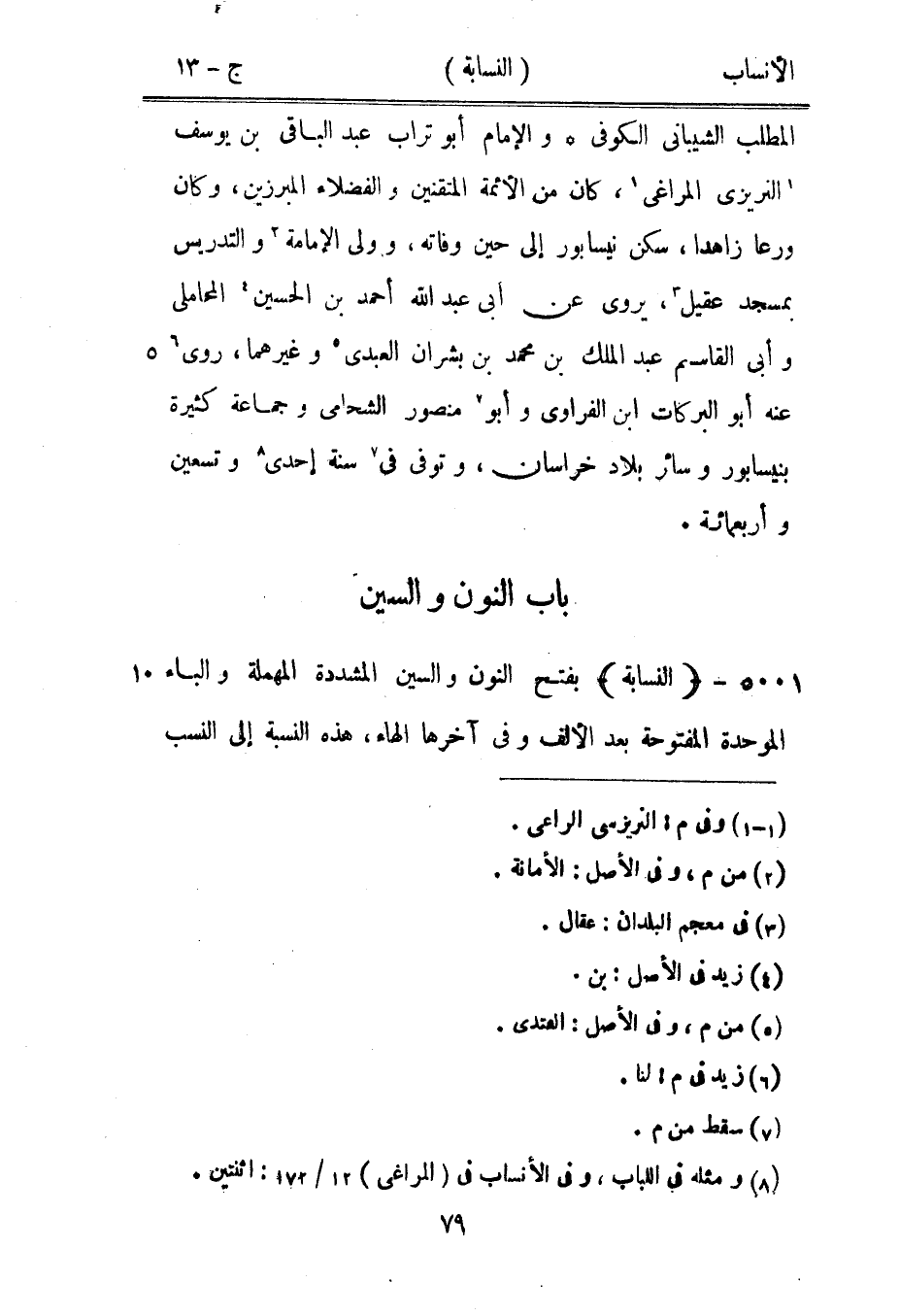 المطلب الشيباني الكوفي والإمام أبو تراب عبد الباقي بن يوسف النريزى المراغي [1] ، كان من الأئمة المتقنين والفضلاء المبرزين، وكان ورعا زاهدا، سكن نيسابور إلى حين وفاته، وولى الإمامة [2] والتدريس بمسجد عقيل [3] ، يروى عن أبى عبد الله أحمد بن الحسين [4] المحاملي وأبى القاسم عبد الملك بن محمد بن بشران العبديّ [5] وغيرهما، روى [6] عنه أبو البركات ابن الفراوي وأبو [7] منصور الشحامي وجماعة كثيرة بنيسابور وسائر بلاد خراسان، وتوفى في [7] سنة إحدى [8] وتسعين وأربعمائة.