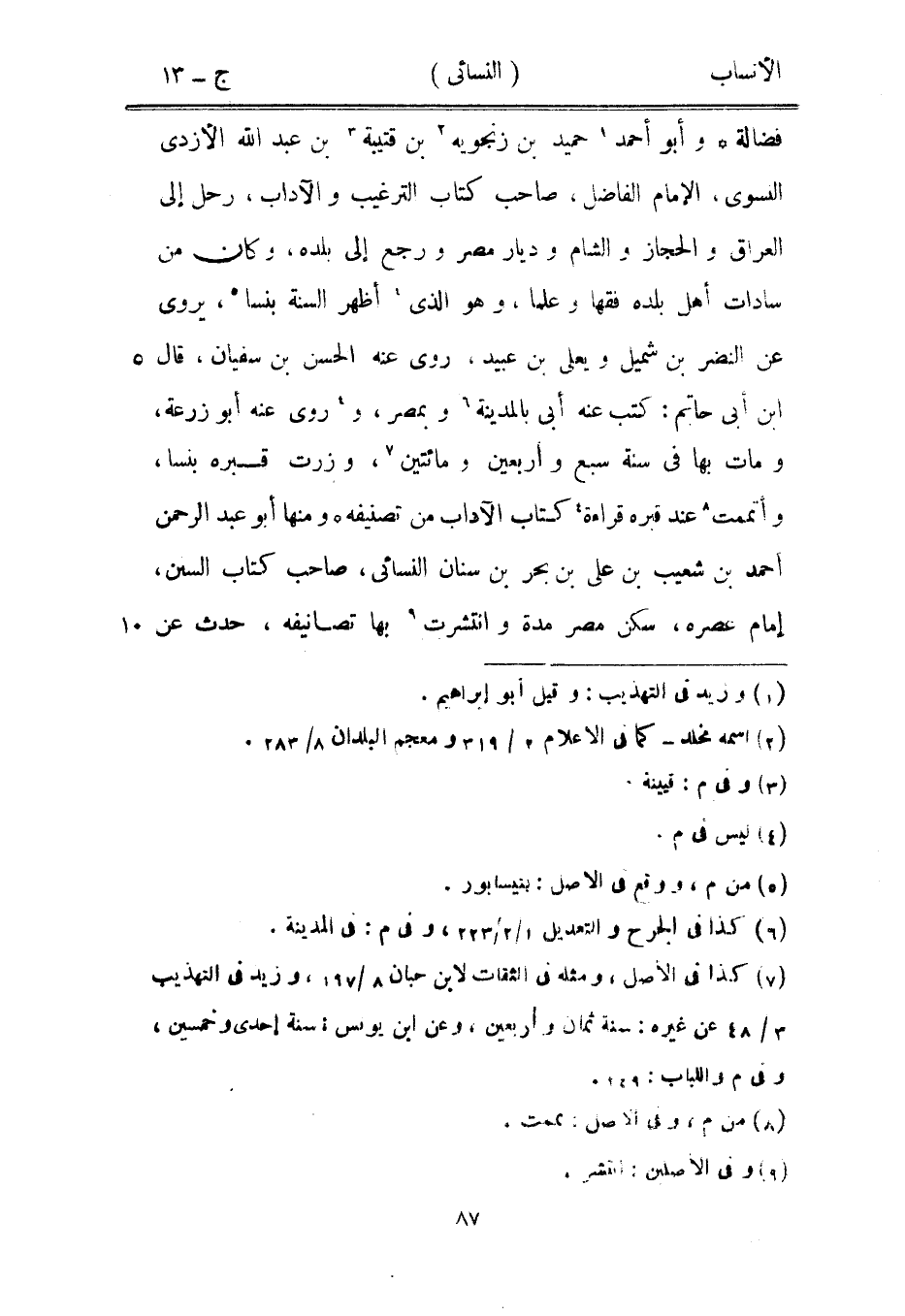 فضالة وأبو أحمد [1] حميد بن زنجويه [2] بن قتيبة [3] بن عبد الله الأزدي النسوي، الإمام الفاضل، صاحب كتاب الترغيب والآداب، رحل إلى العراق والحجاز والشام وديار مصر ورجع إلى بلده، وكان من سادات أهل بلده فقها وعلما، وهو الّذي [4] أظهر السنة بنسا [5] ، يروى عن النضر بن شميل ويعلى بن عبيد، روى عنه الحسن بن سفيان، قال ابن أبى حاتم: كتب عنه أبى بالمدينة [6] وبمصر، و [4] روى عنه أبو زرعة، ومات بها في سنة سبع وأربعين ومائتين [7] ، وزرت قبره بنسا، وأتممت [8] عند قبره قراءة [4] كتاب الآداب من تصنيفه ومنها أبو عبد الرحمن أحمد بن شعيب بن على بن بحر بن سنان النسائي، صاحب كتاب السنن، إمام عصره، سكن مصر مدة وانتشرت [9] بها تصانيفه، حدث عن