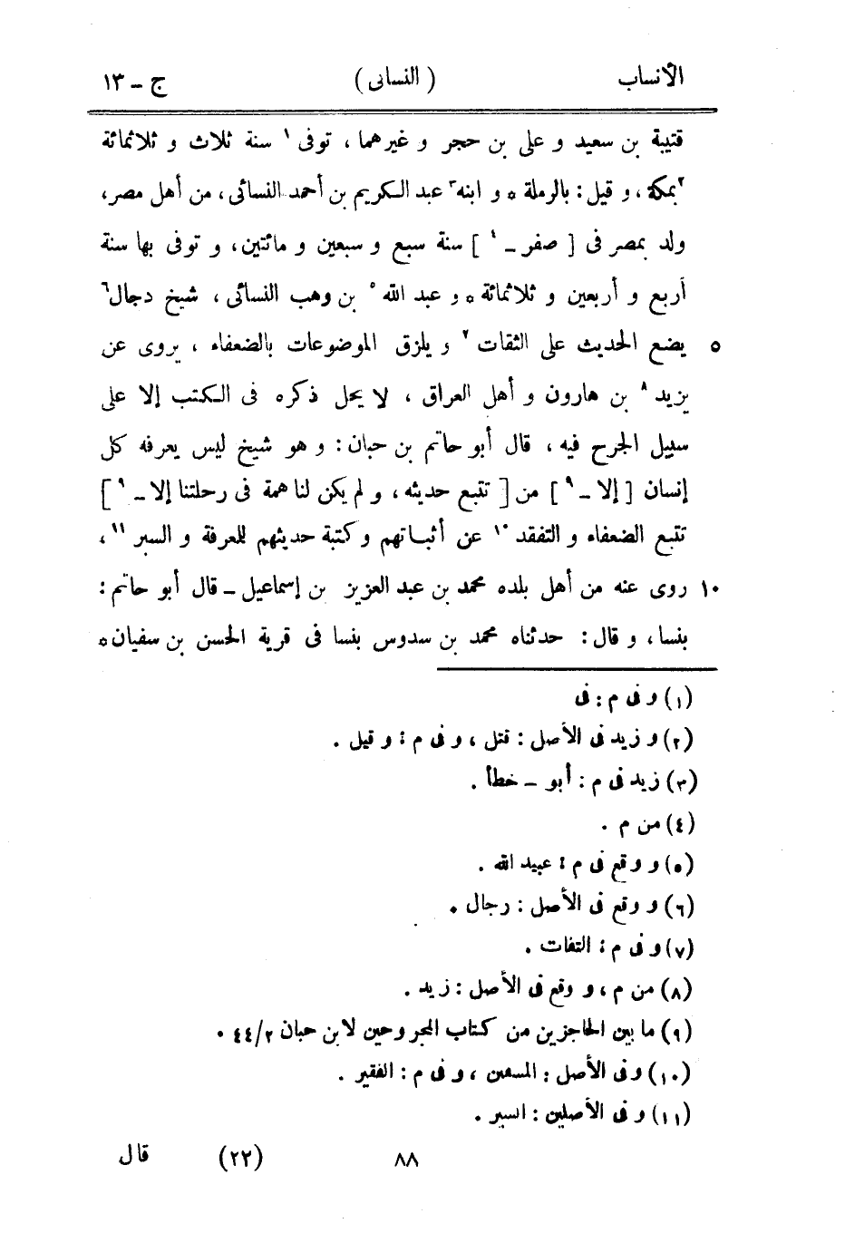 قتيبة بن سعيد وعلى بن حجر وغيرهما، توفى [1] سنة ثلاث وثلاثمائة [2] بمكة، وقيل: بالرملة وابنه [3] عبد الكريم بن أحمد النسائي، من أهل مصر، ولد بمصر في [صفر-[4]] سنة سبع وسبعين ومائتين، وتوفى بها سنة أربع وأربعين وثلاثمائة وعبد الله [5] بن وهب النسائي، شيخ دجال [6] يضع الحديث على الثقات [7] ويلزق الموضوعات بالضعفاء، يروى عن يزيد [8] بن هارون وأهل العراق، لا يحل ذكره في الكتب إلا على سبيل الجرح فيه، قال أبو حاتم بن حبان: وهو شيخ ليس يعرفه كل إنسان [إلا-[9]] من [تتبع حديثه، ولم يكن لنا همة في رحلتنا إلا-[9]] تتبع الضعفاء والتفقد [10] عن أثباتهم وكتبة حديثهم للمعرفة والسبر [11] ، روى عنه من أهل بلده محمد بن عبد العزيز بن إسماعيل- قال أبو حاتم: