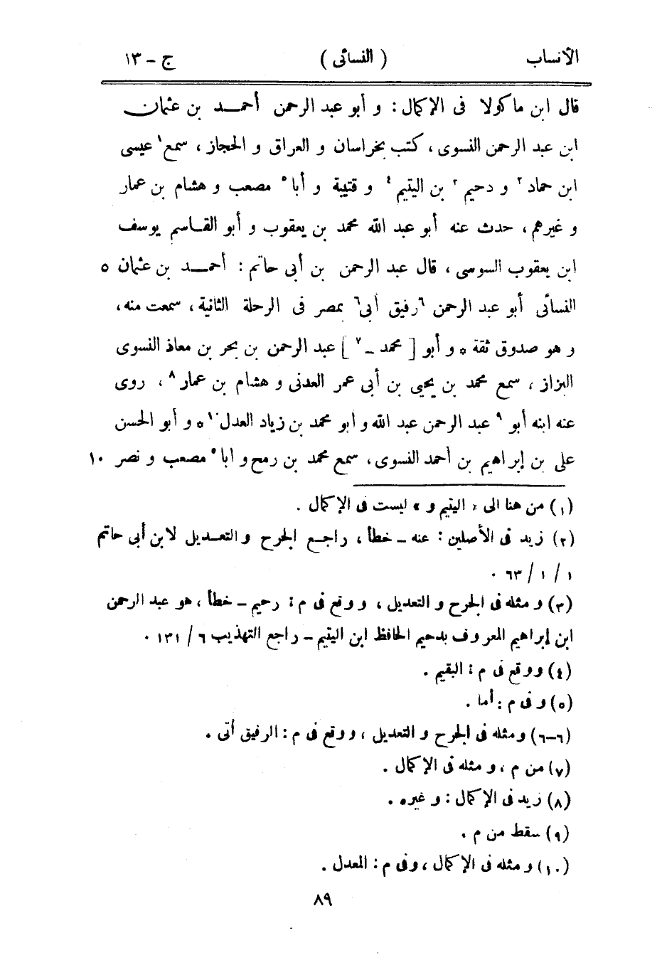 قال ابن ماكولا في الإكمال: وأبو عبد الرحمن أحمد بن عثمان ابن عبد الرحمن النسوي، كتب بخراسان والعراق والحجاز، سمع [1] عيسى ابن حماد [2] ودحيم [3] بن اليتيم [4] وقتيبة وأبا [5] مصعب وهشام بن عمار وغيرهم، حدث عنه أبو عبد الله محمد بن يعقوب وأبو القاسم يوسف ابن يعقوب السوسي، قال عبد الرحمن بن أبى حاتم: أحمد بن عثمان النسائي أبو عبد الرحمن [6] رفيق أبى [6] بمصر في الرحلة الثانية، سمعت منه، وهو صدوق ثقة وأبو [محمد-[7]] عبد الرحمن بن بحر بن معاذ النسوي البزاز، سمع محمد بن يحيى بن أبى عمر العدني وهشام بن عمار [8] ، روى عنه ابنه أبو [9] عبد الرحمن عبد الله وأبو محمد بن زياد العدل [10] وأبو الحسن على بن إبراهيم بن أحمد النسوي، سمع محمد بن رمح وأبا [5] مصعب ونصر