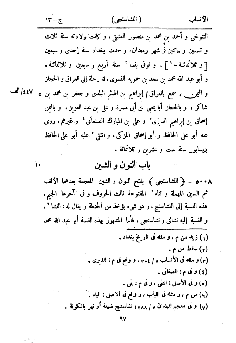 بفتح النون والشين المعجمة بعدهما الألف ثم السين المهملة والتاء [6] المفتوحة ثالث الحروف وفي آخرها الجيم، هذه النسبة إلى النشاستج، وهو شيء يؤخذ من الحنطة ويقال له: النشا [7] ، والنسبة إليه نشائى ونشاستجى، فأما المشهور بهذه النسبة أبو عبد الله محمد