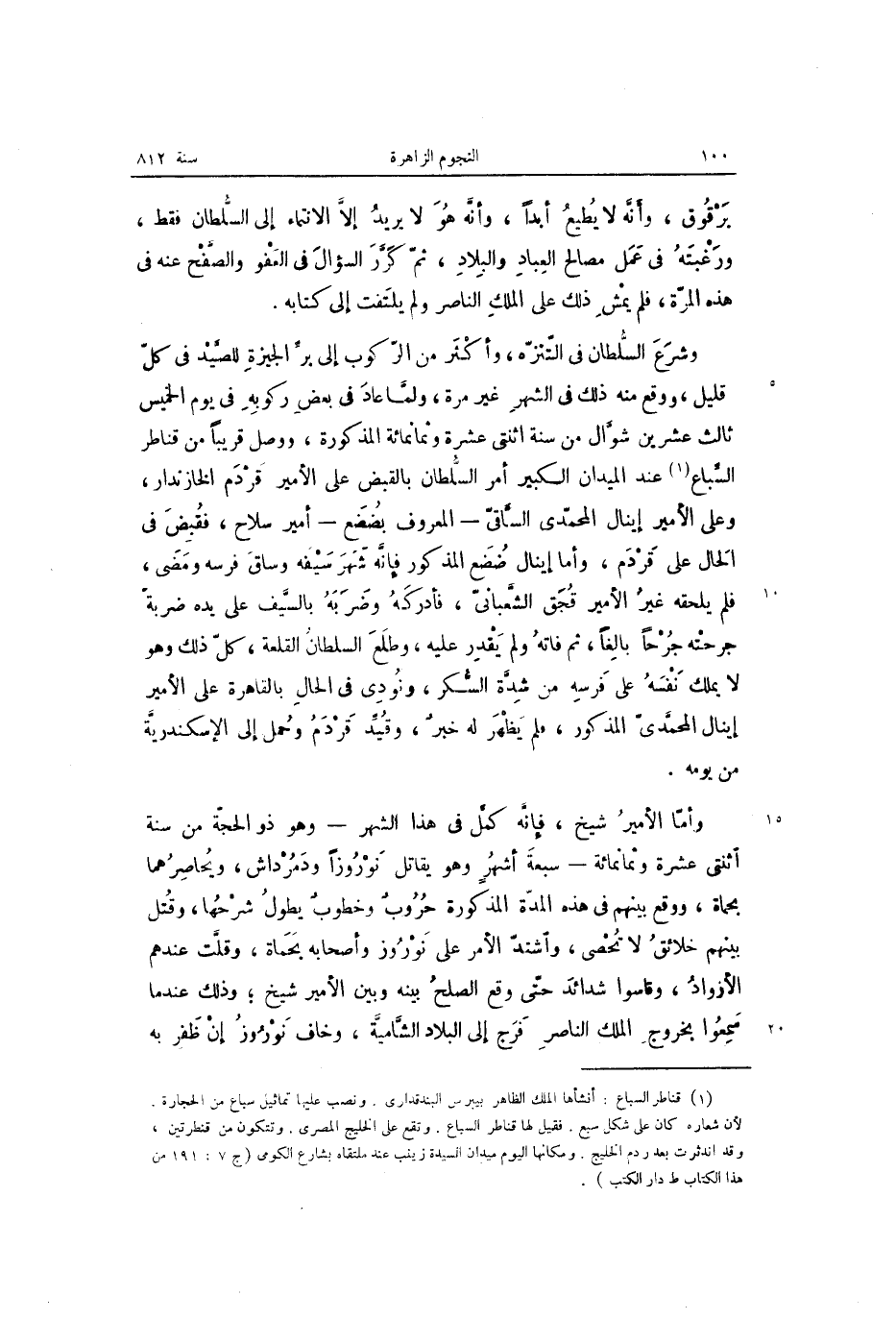 وشرع السّلطان فى التّنزّه، وأكثر من الرّكوب إلى برّ الجيزة للصّيد فى كلّ قليل، ووقع منه ذلك فى الشهر غير مرة، ولمّا عاد فى بعض ركوبه فى يوم الخميس ثالث عشرين شوّال من سنة اثنتى عشرة وثمانمائة المذكورة، ووصل قريبا من قناطر السّباع «1» عند الميدان الكبير أمر السّلطان بالقبض على الأمير قردم الخازندار، وعلى الأمير إينال المحمّدى السّاقىّ- المعروف بضضع- أمير سلاح، فقبض فى الحال على قردم، وأما إينال ضضع المذكور فإنّه شهر سيفه وساق فرسه ومضى، فلم يلحقه غير الأمير قجق الشّعبانىّ، فأدركه وضربه بالسّيف على يده ضربة جرحته جرحا بالغا، ثم فاته ولم يقدر عليه، وطلع السلطان القلعة، كلّ ذلك وهو لا يملك نفسه على فرسه من شدّة السّكر، ونودى فى الحال بالقاهرة على الأمير إينال المحمّدىّ المذكور، فلم يظهر له خبر، وقيّد قردم وحمل إلى الإسكندريّة من يومه.