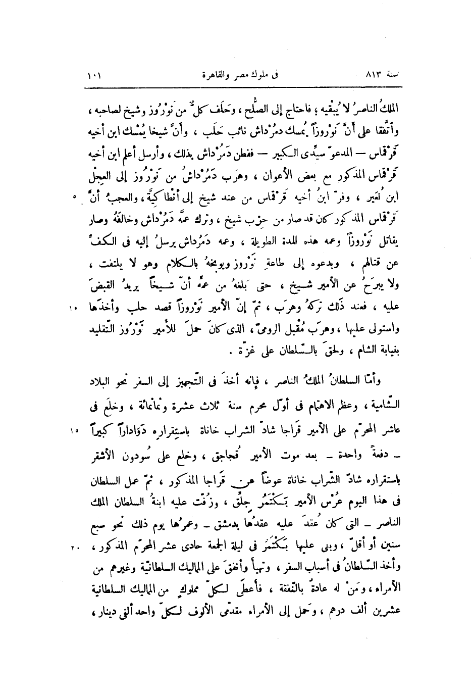 وأمّا السلطان الملك الناصر، فإنه أخذ فى التّجهيز إلى السفر نحو البلاد الشّامية، وعظم الاهتمام فى أوّل محرم سنة ثلاث عشرة وثمانمائة، وخلع فى عاشر المحرّم على الأمير قراجا شادّ الشراب خاناة باستقراره دوادارا كبيرا- دفعة واحدة- بعد موت الأمير قجاجق، وخلع على سودون الأشقر باستقراره شادّ الشّراب خاناة عوضا عن قراجا المذكور، ثمّ عمل السلطان فى هذا اليوم عرس الأمير بكتمر جلّق، وزفّت عليه ابنة السلطان الملك الناصر- التى كان عقد عليه عقدها بدمشق- وعمرها يوم ذلك نحو سبع سنين أو أقلّ، وبنى عليها بكتمر فى ليلة الجمعة حادى عشر المحرّم المذكور، وأخذ السّلطان فى أسباب السفر، وتهيأ وأنفق على المماليك السلطانيّة وغيرهم من الأمراء، ومن له عادة بالنّفقة، فأعطى لكلّ مملوك من المماليك السلطانية عشرين ألف درهم، وحمل إلى الأمراء مقدّمى الألوف لكلّ واحد ألفى دينار،