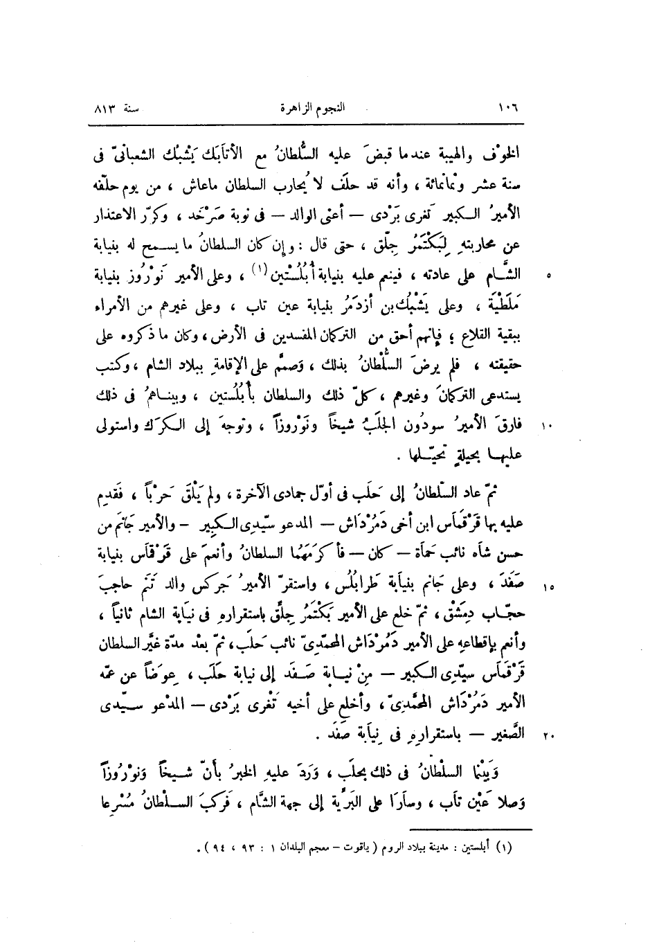 الخوف والهيبة عند ما قبض عليه السّلطان مع الأتابك يشبك الشعبانىّ فى سنة عشر وثمانمائة، وأنه قد حلف لا يحارب السلطان ما عاش، من يوم حلّفه الأمير الكبير تغرى بردى- أعنى الوالد- فى نوبة صرخد، وكرّر الاعتذار عن محاربته لبكتمر جلّق، حتى قال: وإن كان السلطان ما يسمح له بنيابة الشّام على عادته، فينعم عليه بنيابة أبلستين «1» ، وعلى الأمير نوروز بنيابة ملطية، وعلى يشبك بن أزدمر بنيابة عين تاب، وعلى غيرهم من الأمراء ببقية القلاع؛ فإنهم أحق من التركمان المفسدين فى الأرض، وكان ما ذكروه على حقيقته، فلم يرض السّلطان بذلك، وصمّم على الإقامة ببلاد الشام، وكتب يستدعى التركمان وغيرهم، كلّ ذلك والسلطان بأبلستين، وبيناهم فى ذلك فارق الأمير سودون الجلب شيخا ونوروزا، وتوجه إلى الكرك واستولى عليها بحيلة تحيّلها.