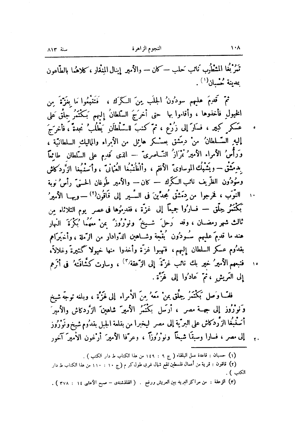 ثمّ قدم عليهم سودون الجلب من الكرك، فتتّبعوا ما بغزّة من الخيول فأخذوها، وأقاموا بها حتى أخرج السّلطان إليهم بكتمر جلّق على عسكر كبير، فسار إلى زرع، ثمّ كتب للسّلطان يطلب نجدة، فأخرج إليه السّلطان من دمشق بعسكر هائل من الأمراء والمماليك السلطانيّة، ورأس الأمراء الأمير تمراز النّاصرىّ- الذي قدم على السّلطان طائعا بدمشق- ويشبك الموساوىّ الأفقم، وألطنبغا العثمانىّ، وأسنبغا الزّرد كاش وسودون الظّريف نائب الكرك- كان- والأمير طوغان الحسنىّ رأس نوبة النّوب، فخرجوا من دمشق مجدّين فى السّير إلى قاقون «2» - وبها الأمير بكتمر جلّق- فساروا جميعا إلى غزّة، فقدموها فى عصر يوم الثلاثاء من ثالث شهر رمضان، وقد رحل شيخ ونوروز بمن معهما بكرة النهار عند ما قدم عليهم سودون بقجة وشاهين الدّوادار من الرّملة، وأخبراهم بقدوم عسكر السلطان إليهم، فنهبوا غزّة وأخذوا منها خيولا كثيرة وغلالا، فتبعهم الأمير خير بك نائب غزّة إلى الزّعقة «3» ، وسارت كشّافته فى أثرهم إلى العريش، ثمّ عادوا إلى غزّة.