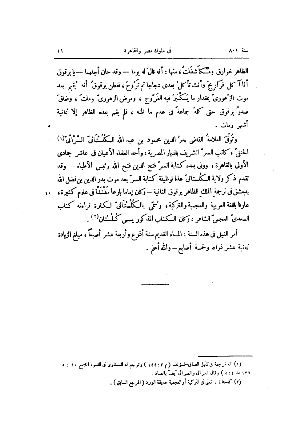 وتوفّى العلامة القاضى بدر الدين محمود بن عبد الله الكلستانىّ السّرّائىّ «1» الحنفىّ، كاتب السرّ الشريف بالديار المصرية، وأحد العلماء الأعيان فى عاشر جمادى الأولى بالقاهرة، وولى بعده كتابة السرّ فتح الدين فتح الله رئيس الأطباء- وقد تقدم ذكر ولاية الكلستانىّ هذا لوظيفة كتابة السرّ بعد موت بدر الدين بن فضل الله بدمشق فى ترجمة الملك الظاهر برقوق الثانية- وكان إماما بارعا مفتنّا فى علوم كثيرة، عارفا باللغة العربية والعجمية والتركية، وسمّى بالكلستانىّ لكثرة قراءته كتاب السعدىّ العجمىّ الشاعر، وكان الكتاب المذكور يسمى كلستان «2» .