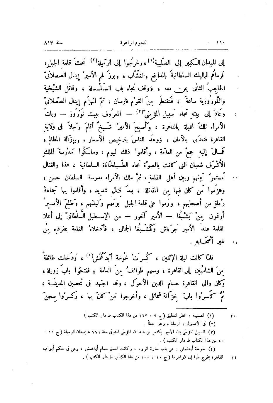 إلى الميدان الكبير إلى الصّليبة «1» ، وخرجوا إلى الرّميلة «2» تحت قلعة الجبل، فرماهم المماليك السلطانية بالمدافع والنّشّاب، وبرز لهم الأمير إينال الصصلانىّ الحاجب الثانى بمن معه، ووقف تجاه باب السّلسلة، وقاتل الشيخية والنّوروزية ساعة، فتقنطر من القوم فارسان، ثمّ انهزم إينال الصّصلانىّ وعاد إلى بيته تجاه سبيل المؤمنىّ «3» - المعروف ببيت نوروز- وبات الأمراء تلك الليلة بالقاهرة، وأصبح الأمير شيخ أقام رجلا فى ولاية القاهرة فنادى بالأمان، ووعد الناس بترخيص الأسعار، وبإزالة المظالم، فمال إليه جمع من العامّة، وأقاموا ذلك اليوم، وملكوا مدرسة الملك الأشرف شعبان التى كانت بالصوّة تجاه الطّبلخاناة السلطانية، هذا والقتال مستمر بينهم وبين أهل القلعة، ثمّ ملك الأمراء مدرسة السلطان حسن، وهزموا من كان فيها من المقاتلة، بعد قتال شديد، وأقاموا بها جماعة رماة من أصحابهم، ورموا على قلعة الجبل يومهم وليلتهم، وطلع الأمير أرغون من بشبغا- الأمير آخور- من الإسطبل السّلطانىّ إلى أعلا القلعة عند الأمير جرباش وكمشبغا الجمالى، فأدخلاه القلعة بمفرده من غير أصحابه.