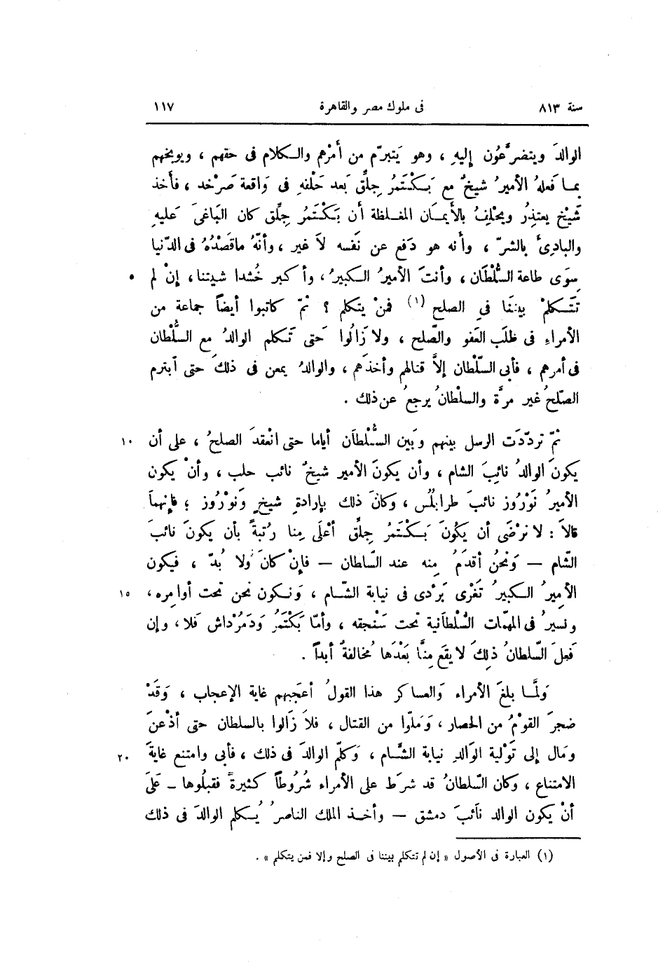 ولمّا بلغ الأمراء والعساكر هذا القول أعجبهم غاية الإعجاب، وقد ضجر القوم من الحصار، وملّوا من القتال، فلا زالوا بالسلطان حتى أذعن ومال إلى تولية الوالد نيابة الشّام، وكلّم الوالد فى ذلك، فأبى وامتنع غاية الامتناع، وكان السّلطان قد شرط على الأمراء شروطا كثيرة فقبلوها- على أن يكون الوالد نائب دمشق- وأخذ الملك الناصر يكلم الوالد فى ذلك