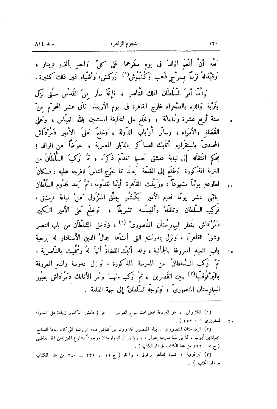 وأمّا أمر السّلطان الملك النّاصر، فإنّه سار من القدس حتّى نزل بتربة والده بالصّحراء خارج القاهرة فى يوم الأربعاء ثانى عشر المحرّم من سنة أربع عشرة وثمانمائة، وخلع على الخليفة المستعين بالله العبّاس، وعلى القضاة والأمراء، وسائر أرباب الدّولة، وخلع على الأمير دمرداش المحمدىّ باستقراره أتابك العساكر بالدّيار المصرية، عوضا عن الوالد؛ بحكم انتقاله إلى نيابة دمشق حسبما تقدّم ذكره، ثمّ ركب السّلطان من التربة المذكورة وطلع إلى القلعة بعد ما خرج الناس للفرجة عليه، فكان لطلوعه يوما مشهودا، وزيّنت القاهرة أياما لقدومه، ثمّ بعد قدوم السّلطان باثنى عشر يوما قدم الأمير بكتمر جلّق المعزول عن نيابة دمشق، فركب السّلطان وتلقّاه وألبسه تشريفا، وخلع على الأمير الكبير دمرداش بنظر البيمارستان المنصورىّ «2» ، ودخل السّلطان من باب النصر وشقّ القاهرة، ونزل بمدرسته التى أنشأها جمال الدين الأستادار له برحبة باب العيد المعروفة بالجمالية، وقد أثبت القضاة أنها له وسمّيت بالنّاصرية، ثمّ ركب السّلطان من المدرسة المذكورة، ونزل بمدرسة والده المعروفة بالبرقوقيّة «3» ببين القصرين، ثمّ ركب منها وأمر الأتابك دمرداش بعبور البيمارستان المنصورىّ، وتوجّه السّلطان إلى جهة القلعة.