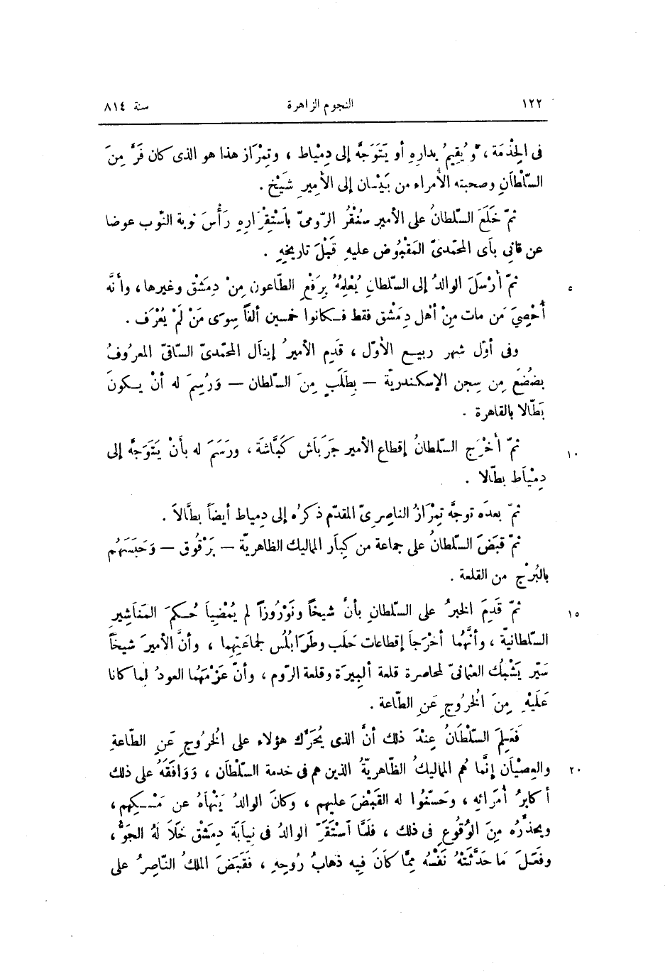 فعلم السّلطان عند ذلك أنّ الذي يحرّك هؤلاء على الخروج عن الطّاعة والعصيان إنّما هم المماليك الظّاهريّة الذين هم فى خدمة السّلطان، ووافقه على ذلك أكابر أمرائه، وحسّنوا له القبض عليهم، وكان الوالد ينهاه عن مسكهم، ويحذّره من الوقوع فى ذلك، فلمّا استقرّ الوالد فى نيابة دمشق خلا له الجوّ، وفعل ما حدّثته نفسه ممّا كان فيه ذهاب روحه، فقبض الملك النّاصر على