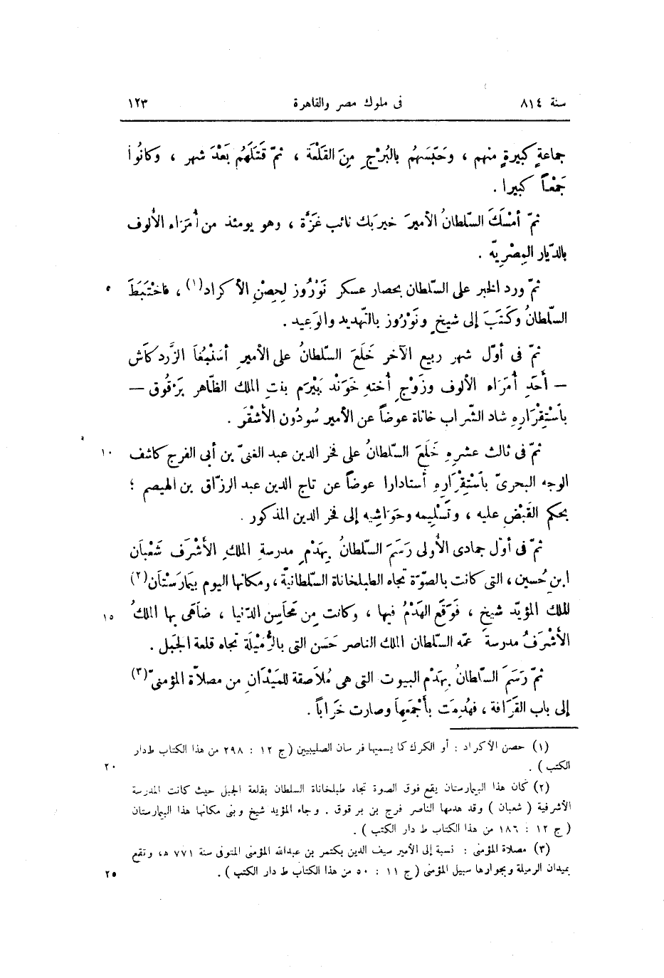 ثمّ رسم السّلطان بهدم البيوت التى هى ملاصقة للميدان من مصلّاة المؤمنىّ «3» إلى باب القرافة، فهدمت بأجمعها وصارت خرابا.