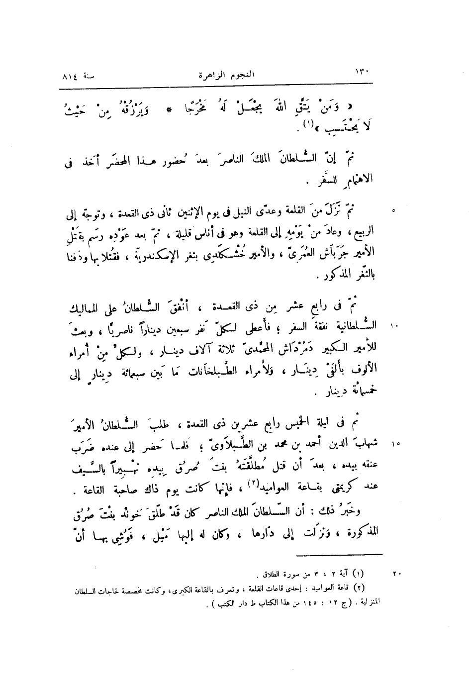 ثم فى ليلة الخميس رابع عشرين ذى القعدة، طلب السّلطان الأمير شهاب الدين أحمد بن محمد بن الطّبلاوىّ؛ فلما حضر إلى عنده ضرب عنقه بيده، بعد أن قتل مطلّقته بنت صرق بيده تهبيرا بالسّيف عند كريمتى بقاعة العواميد «2» ، فإنها كانت يوم ذاك صاحبة القاعة.
