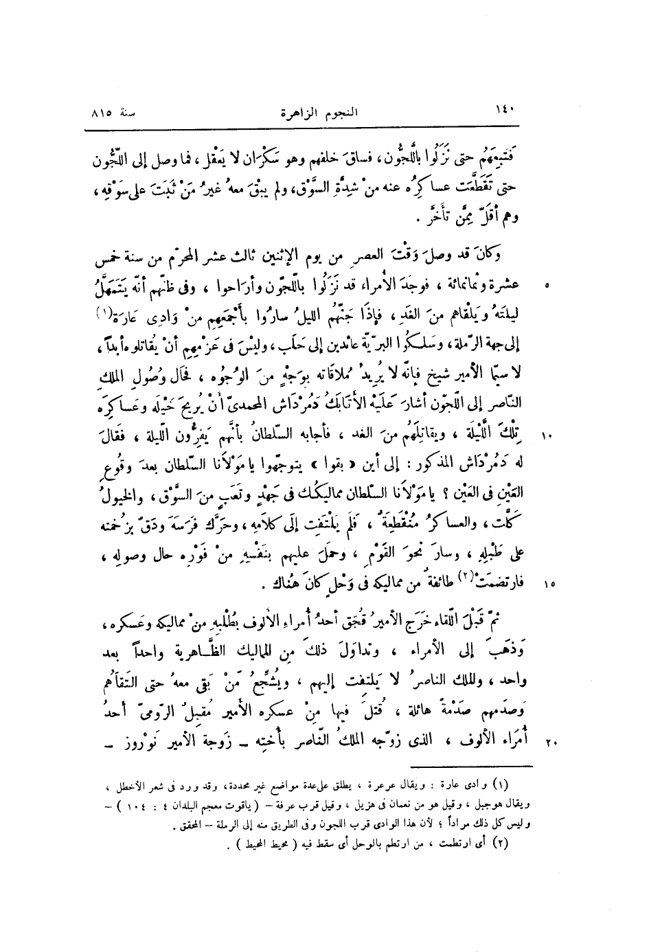 وكان قد وصل وقت العصر من يوم الاثنين ثالث عشر المحرّم من سنة خمس عشرة وثمانمائة، فوجد الأمراء قد نزلوا باللّجّون وأراحوا، وفى ظنّهم أنّه يتمهّل ليلته ويلقاهم من الغد، فإذا جنّهم الليل ساروا بأجمعهم من وادى عارة «1» إلى جهة الرّملة، وسلكوا البرّيّة عائدين إلى حلب، وليس فى عزمهم أن يقاتلوه أبدا، لا سيّما الأمير شيخ فإنّه لا يريد ملاقاته بوجه من الوجوه، فحال وصول الملك النّاصر إلى اللّجّون أشار عليه الأتابك دمرداش المحمدىّ أن يريح خيله وعساكره تلك اللّيلة، ويقاتلهم من الغد، فأجابه السّلطان بأنّهم يفرّون اللّيلة، فقال له دمرداش المذكور: إلى أين «بقوا» يتوجّهوا يا مولانا السّلطان بعد وقوع العين فى العين؟ يا مولانا السّلطان مماليكك فى جهد وتعب من السّوق، والخيول كلّت، والعساكر منقطعة، فلم يلتفت إلى كلامه، وحرّك فرسه ودقّ بزخمته على طبله، وسار نحو القوم، وحمل عليهم بنفسه من فوره حال وصوله، فارتضمت «2» طائفة من مماليكه فى وحل كان هناك.