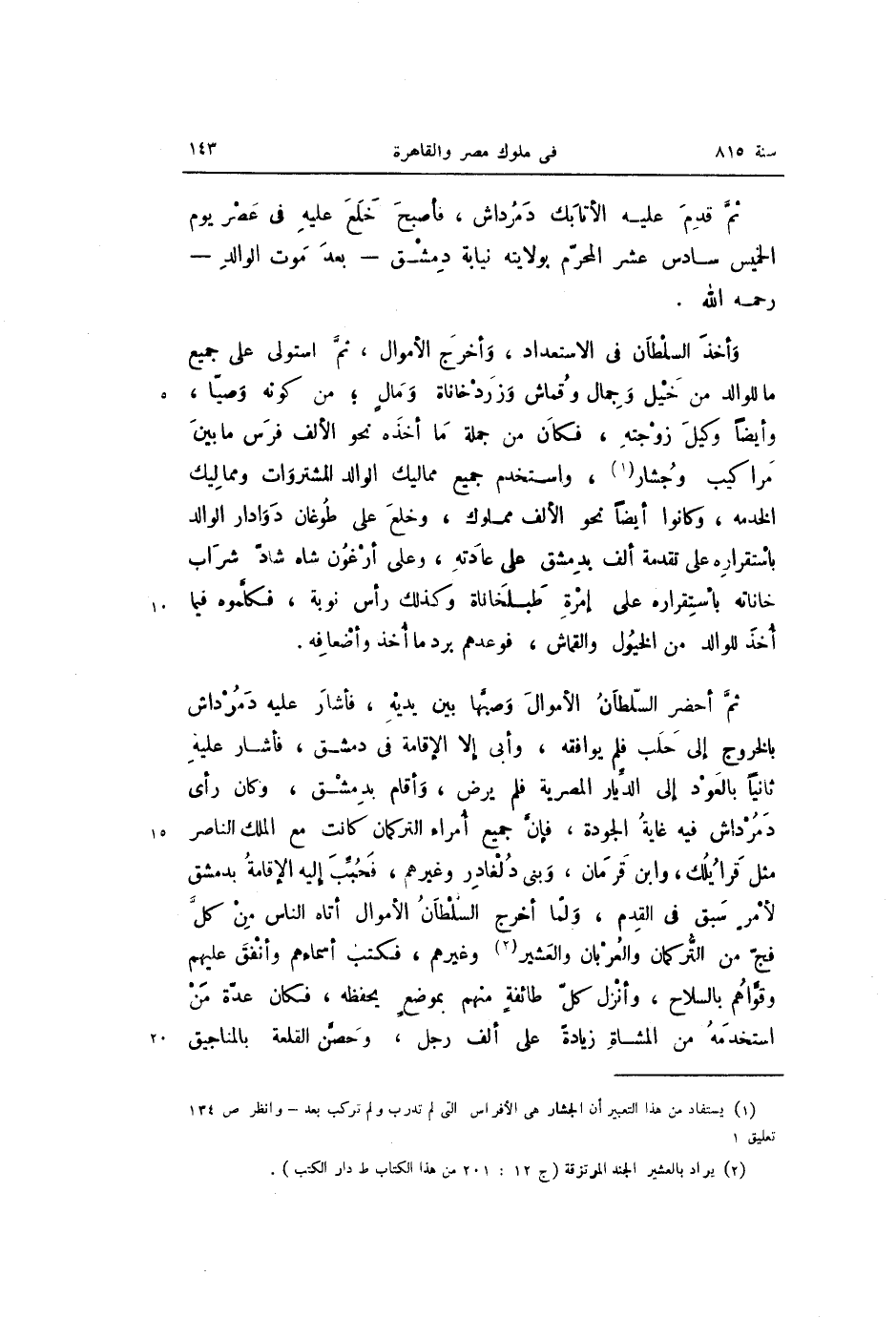 ثمّ أحضر السّلطان الأموال وصبّها بين يديه، فأشار عليه دمرداش بالخروج إلى حلب فلم يوافقه، وأبى إلا الإقامة فى دمشق، فأشار عليه ثانيا بالعود إلى الدّيار المصرية فلم يرض، وأقام بدمشق، وكان رأى دمرداش فيه غاية الجودة، فإنّ جميع أمراء التركمان كانت مع الملك الناصر مثل قرايلك، وابن قرمان، وبنى دلغادر وغيرهم، فحبّب إليه الإقامة بدمشق لأمر سبق فى القدم، ولما أخرج السلطان الأموال أتاه الناس من كلّ فجّ من التّركمان والعربان والعشير «2» وغيرهم، فكتب أسماءهم وأنفق عليهم وقوّاهم بالسلاح، وأنزل كلّ طائفة منهم بموضع يحفظه، فكان عدّة من استخدمه من المشاة زيادة على ألف رجل، وحصّن القلعة بالمناجيق