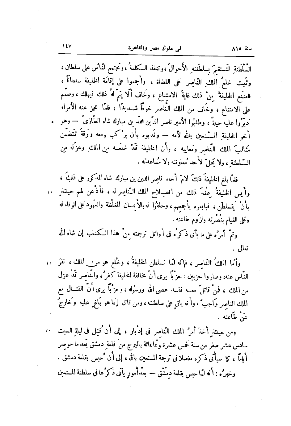 السّلطنة لتستقيم بسلطنته الأحوال، وتنفذ الكلمة، وتجتمع النّاس على سلطان، وثبت خلع الملك النّاصر على القضاة، وأجمعوا على إقامة الخليفة سلطانا، فامتنع الخليفة من ذلك غاية الامتناع، وخاف ألّا يتمّ له ذلك فيهلك، وصمّ على الامتناع، وخاف من الملك النّاصر خوفا شديدا، فلمّا عجز عنه الأمراء دبّروا عليه حيلة، وطلبوا الأمير ناصر الدّين محمّد بن مبارك شاه الطّازىّ- وهو أخو الخليفة المستعين بالله لأمه- وندبوه بأن يركب ومعه ورقة تتضمّن مثالب الملك النّاصر ومعايبه، وأن الخليفة قد خلعه من الملك وعزله من السّلطنة، ولا يحلّ لأحد معاونته ولا مساعدته.