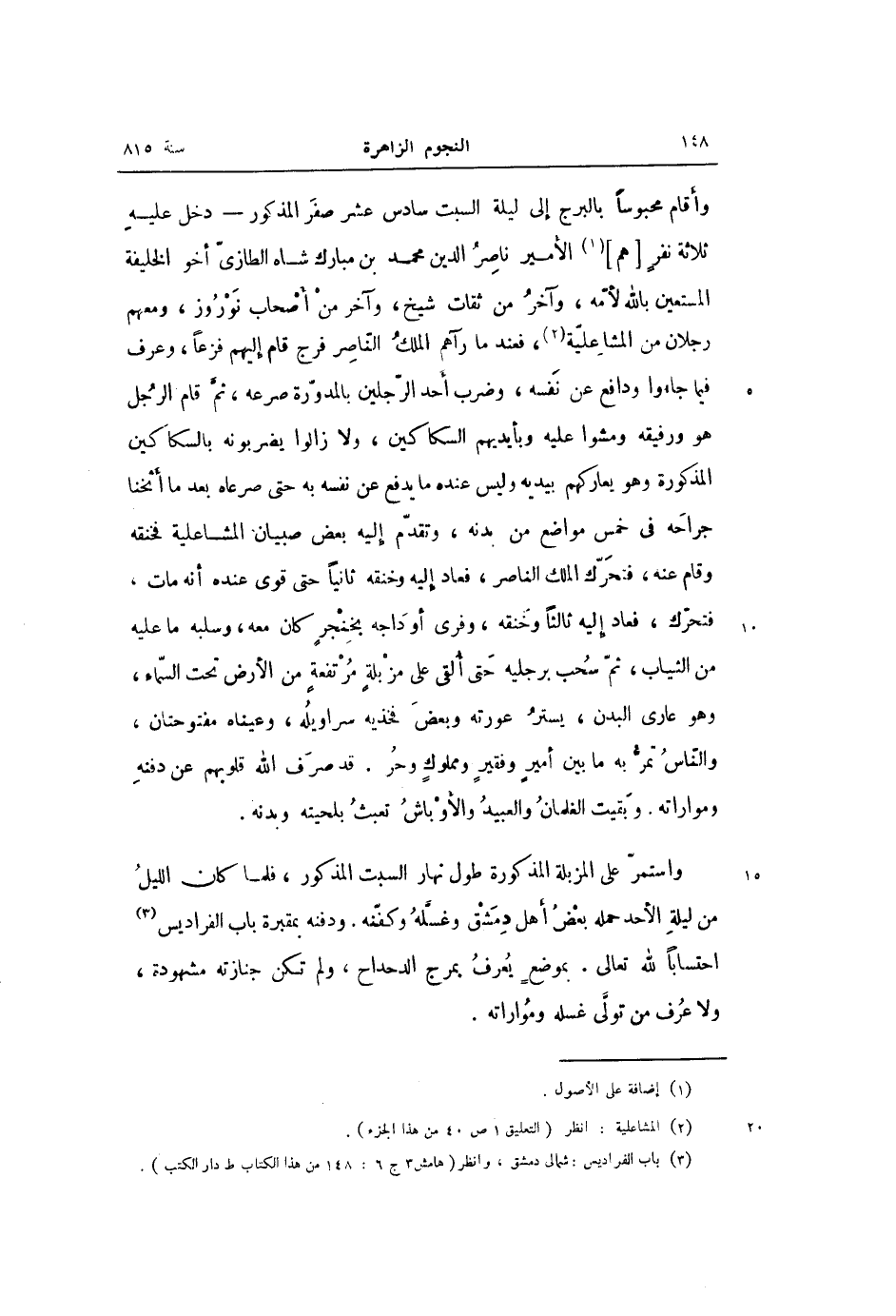 وأقام محبوسا بالبرج إلى ليلة السبت سادس عشر صفر المذكور- دخل عليه ثلاثة نفر [هم] «1» الأمير ناصر الدين محمد بن مبارك شاه الطازىّ أخو الخليفة المستعين بالله لأمّه، وآخر من ثقات شيخ، وآخر من أصحاب نوروز، ومعهم رجلان من المشاعلية «2» ، فعند ما رآهم الملك النّاصر فرج قام إليهم فزعا، وعرف فيما جاءوا ودافع عن نفسه، وضرب أحد الرّجلين بالمدوّرة صرعه، ثمّ قام الرجل هو ورفيقه ومشوا عليه وبأيديهم السكاكين، ولا زالوا يضربونه بالسكاكين المذكورة وهو يعاركهم بيديه وليس عنده ما يدفع عن نفسه به حتى صرعاه بعد ما أثخنا جراحه فى خمس مواضع من بدنه، وتقدّم إليه بعض صبيان المشاعلية فخنقه وقام عنه، فتحرّك الملك الناصر، فعاد إليه وخنقه ثانيا حتى قوى عنده أنه مات، فتحرّك، فعاد إليه ثالثا وخنقه، وفرى أو داجه بخنجر كان معه، وسلبه ما عليه من الثياب، ثمّ سحب برجليه حتى ألقى على مزبلة مرتفعة من الأرض تحت السّماء، وهو عارى البدن، يستر عورته وبعض فخذيه سراويله، وعيناه مفتوحتان، والنّاس تمرّ به ما بين أمير وفقير ومملوك وحر. قد صرف الله قلوبهم عن دفنه ومواراته. وبقيت الغلمان والعبيد والأوباش تعبث بلحيته وبدنه.