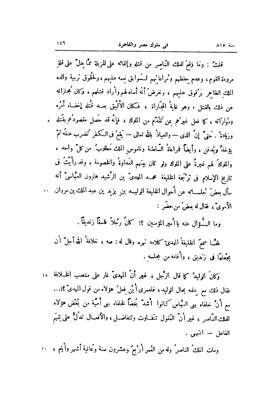 قلت: وما وقع للملك النّاصر من قتله وإلقائه على المزبلة ممّا يدلّ على قلة مروءة القوم، وعدم حفظهم ومراعاتهم لسوابق نعمه عليهم، ولحقوق تربية والده الملك الظاهر برقوق عليهم، ونفرض أنّه أساء لهم وأراد قتلهم، وكان مجازاته عن ذلك بالقتل، وهو غاية المجاراة، فكان الأليق بعد قتله إخفاء أمره ومواراته، كما فعل غيرهم بمن تقدّم من الملوك، فإنّه قد حصل مقصودهم بقتله وزيادة. حتىّ إنّ الذي- والعياذ بالله تعالى- يقع فى الكفر تضرب عنقه ثمّ يؤخذ ويدفن، وأيضا فمراعاة السّلطنة وناموس الملك مطلوب من كلّ واحد، والملوك لهم غيرة على الملوك ولو كان بينهم العداوة والخصومة، وقد رأيت فى تاريخ الإسلام فى ترجمة الخليفة محمد المهدىّ بن الرّشيد هارون العبّاسىّ أنه سأل بعض جلسائه عن أحوال الخليفة الوليد بن يزيد بن عبد الملك بن مروان الأموىّ، فقال له بعض من حضر: