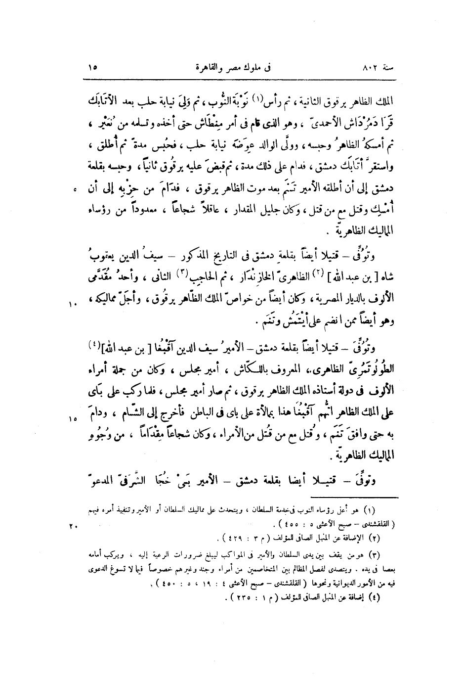 الملك الظاهر برقوق الثانية، ثم رأس «1» نوبة النّوب، ثم ولى نيابة حلب بعد الأتابك قرا دمرداش الأحمدىّ، وهو الذي قام فى أمر منطاش حتى أخذه وتسلمه من نعير، ثم أمسكه الظاهر وحبسه، وولّى الوالد عوضه نيابة حلب، فحبس مدة ثم أطلق، واستقرّ أتابك دمشق، فدام على ذلك مدة، ثم قبض عليه برقوق ثانيا، وحبسه بقلعة دمشق إلى أن أطلقه الأمير تسنم بعد موت الظاهر برقوق، فدام من حزبه إلى أن أمسك وقتل مع من قتل، وكان جليل المقدار، عاقلا شجاعا، معدودا من رؤساء المماليك الظاهريّة.