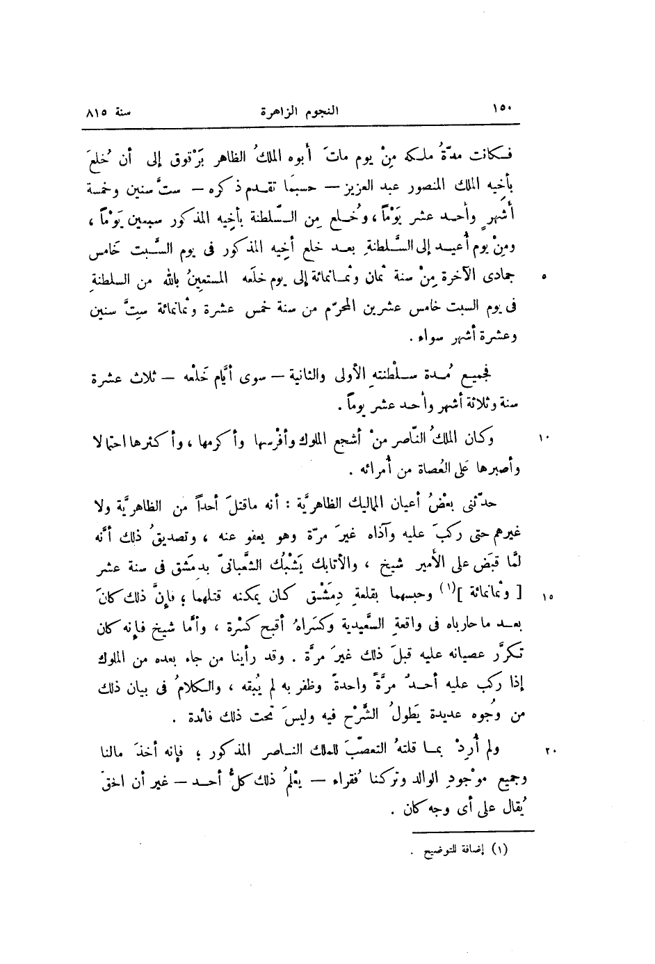 فكانت مدّة ملكه من يوم مات أبوه الملك الظاهر برقوق إلى أن خلع بأخيه الملك المنصور عبد العزيز- حسبما تقدم ذكره- ستّ سنين وخمسة أشهر وأحد عشر يوما، وخلع من السّلطنة بأخيه المذكور سبعين يوما، ومن يوم أعيد إلى السّلطنة بعد خلع أخيه المذكور فى يوم السّبت خامس جمادى الآخرة من سنة ثمان وثمانمائة إلى يوم خلعه المستعين بالله من السلطنة فى يوم السبت خامس عشرين المحرّم من سنة خمس عشرة وثمانمائة ستّ سنين وعشرة أشهر سواء.