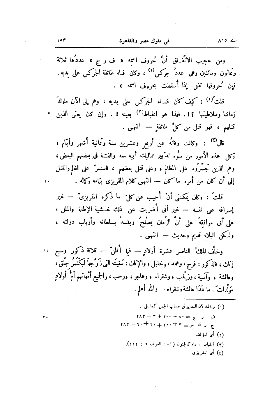 ومن عجيب الاتّفاق أنّ حروف اسمه «ف ر ج» عددها ثلاثة وثمانون ومائتين وهى عدد جركس «1» ، وكان فناء طائفة الجركس على يديه.
