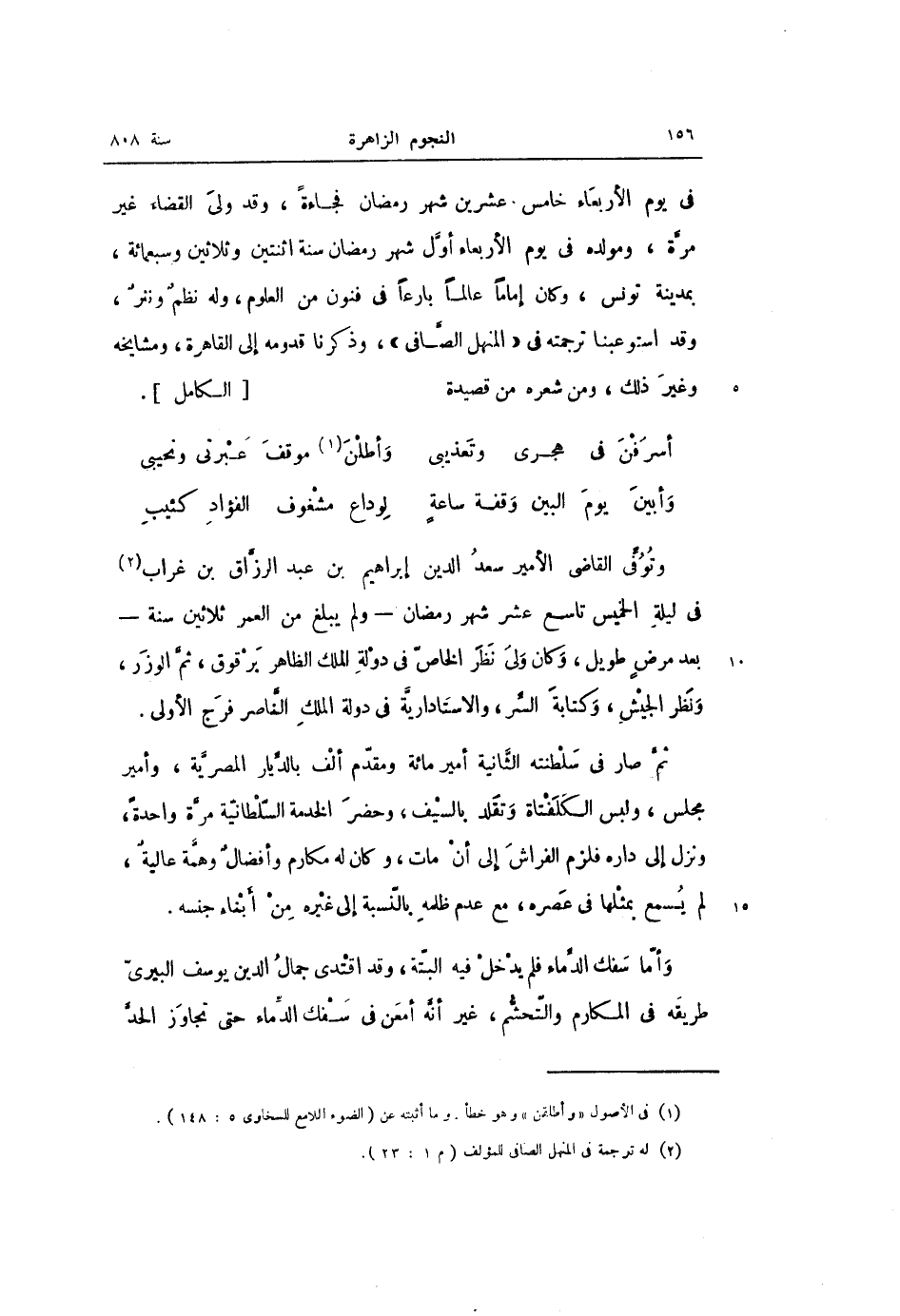 فى يوم الأربعاء خامس عشرين شهر رمضان فجاءة، وقد ولى القضاء غير مرّة، ومولده فى يوم الأربعاء أوّل شهر رمضان سنة اثنتين وثلاثين وسبعمائة، بمدينة تونس، وكان إماما عالما بارعا فى فنون من العلوم، وله نظم ونثر، وقد استوعبنا ترجمته فى «المنهل الصّافى» ، وذكرنا قدومه إلى القاهرة، ومشايخه وغير ذلك، ومن شعره من قصيدة [الكامل] .