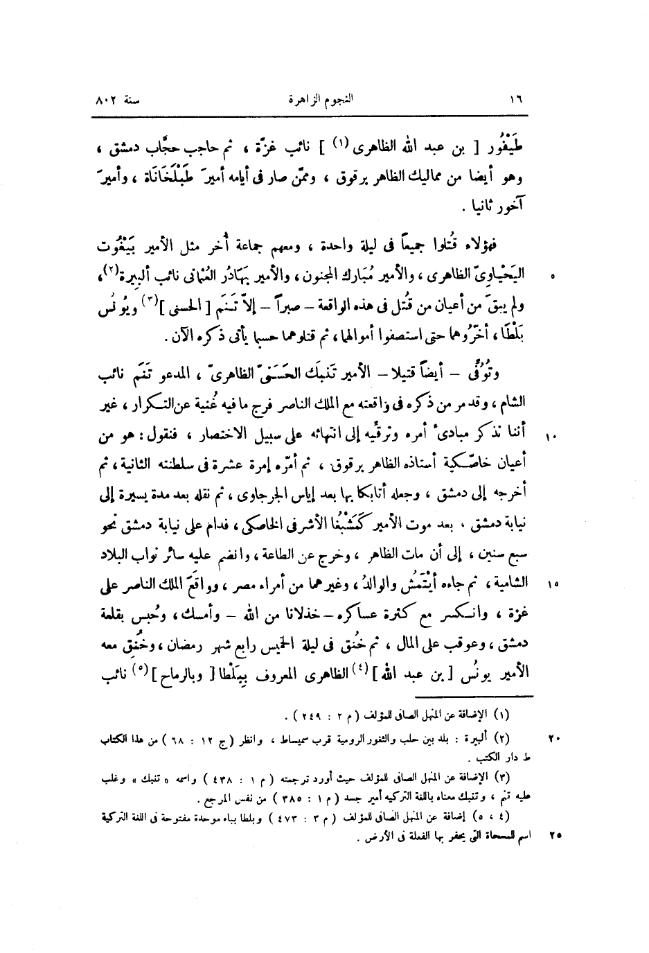 وتوفّى- أيضا قتيلا- الأمير تنبك الحسنىّ الظاهرىّ، المدعو تنم نائب الشام، وقد مر من ذكره فى واقعته مع الملك الناصر فرج ما فيه غنية عن التكرار، غير أننا نذكر مبادئ أمره وترقّيه إلى انتهائه على سبيل الاختصار، فنقول: هو من أعيان خاصّكية أستاذه الظاهر برقوق، ثم أمّره إمرة عشرة فى سلطنته الثانية، ثم أخرجه إلى دمشق، وجعله أتابكا بها بعد إياس الجرجاوى، ثم نقله بعد مدة يسيرة إلى نيابة دمشق، بعد موت الأمير كمشبغا الأشرفى الخاصكى، فدام على نيابة دمشق نحو سبع سنين، إلى أن مات الظاهر، وخرج عن الطاعة، وانضم عليه سائر نواب البلاد الشامية، ثم جاءه أيتمش والوالد، وغيرهما من أمراء مصر، وواقع الملك الناصر على غزة، وانكسر مع كثرة عساكره- خذلانا من الله- وأمسك، وحبس بقلعة دمشق، وعوقب على المال، ثم خنق فى ليلة الخميس رابع شهر رمضان، وخنق معه الأمير يونس [بن عبد الله] «4» الظاهرى المعروف ببلطا [وبالرماح] «5» نائب