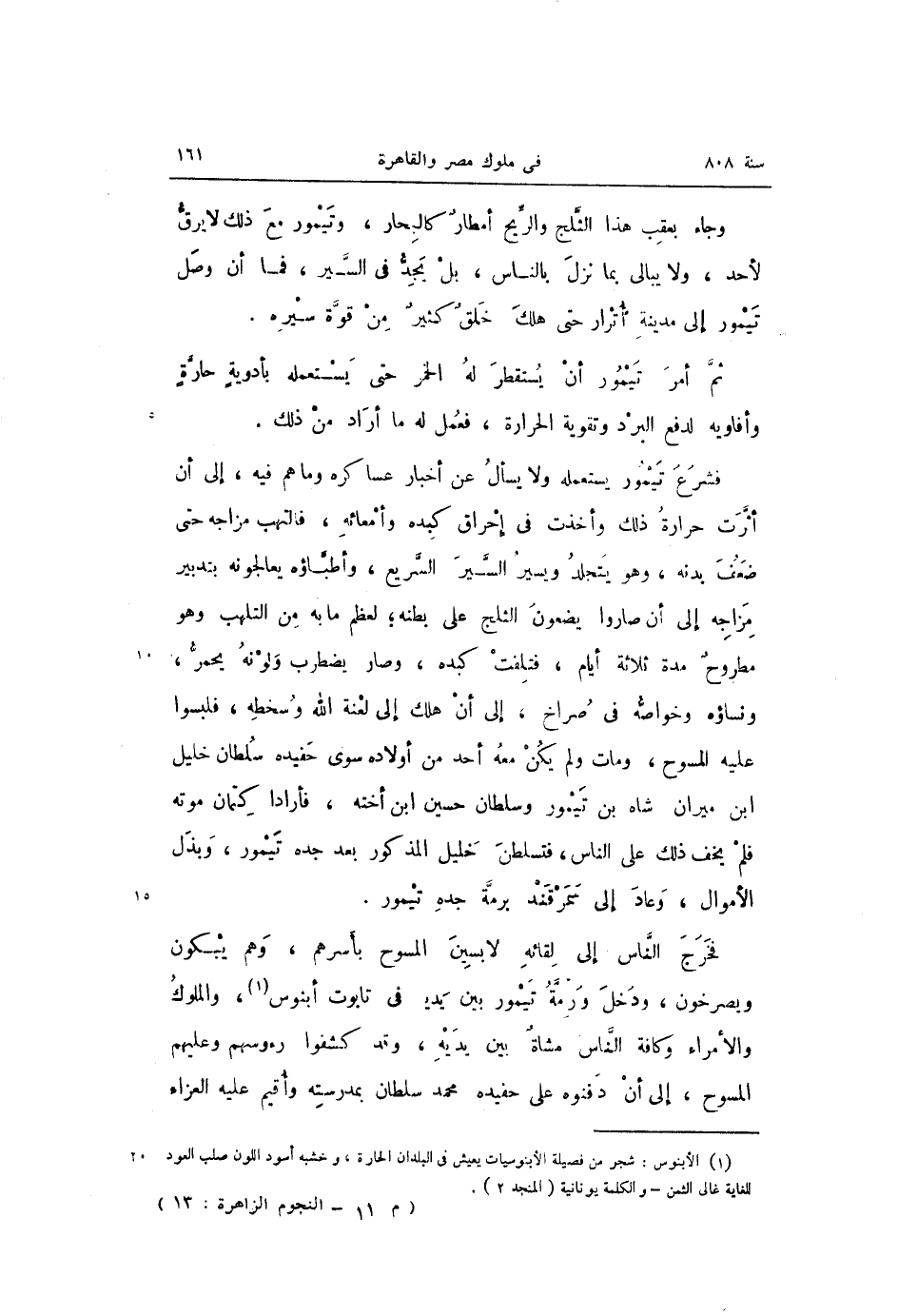 فشرع تيمور يستعمله ولا يسأل عن أخبار عساكره وما هم فيه، إلى أن أثّرت حرارة ذلك وأخذت فى إحراق كبده وأمعائه، فالتهب مزاجه حتى ضعف بدنه، وهو يتجلد ويسير السّير السّريع، وأطبّاؤه يعالجونه بتدبير مزاجه إلى أن صاروا يضعون الثلج على بطنه؛ لعظم ما به من التلهب وهو مطروح مدة ثلاثة أيام، فتلفت كبده، وصار يضطرب ولونه يحمرّ، ونساؤه وخواصّه فى صراخ، إلى أن هلك إلى لعنة الله وسخطه، فلبسوا عليه المسوح، ومات ولم يكن معه أحد من أولاده سوى حفيده سلطان خليل ابن ميران شاه بن تيمور وسلطان حسين ابن أخته، فأرادا كتمان موته فلم يخف ذلك على الناس، فتسلطن خليل المذكور بعد جده تيمور، وبذل الأموال، وعاد إلى سمرقند برمّة جده تيمور.