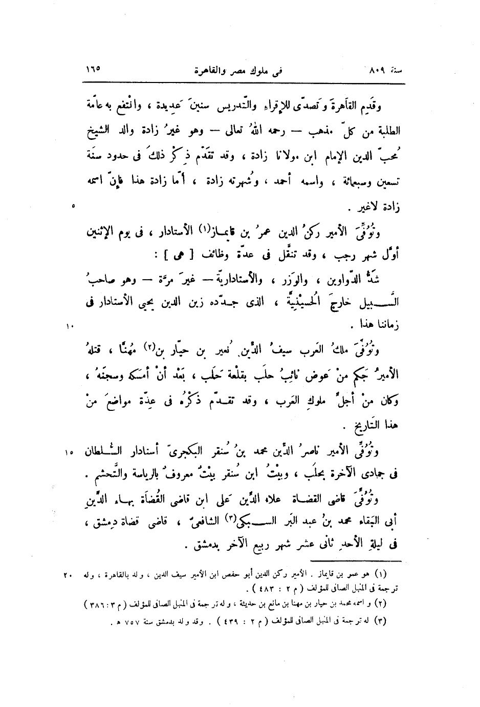 وتوفّى ملك العرب سيف الدّين نعير بن حيّار بن «2» مهنّا، قتله الأمير جكم من عوض نائب حلب بقلعة حلب، بعد أن أمسكه وسجنه، وكان من أجلّ ملوك العرب، وقد تقدّم ذكره فى عدّة مواضع من هذا التاريخ.