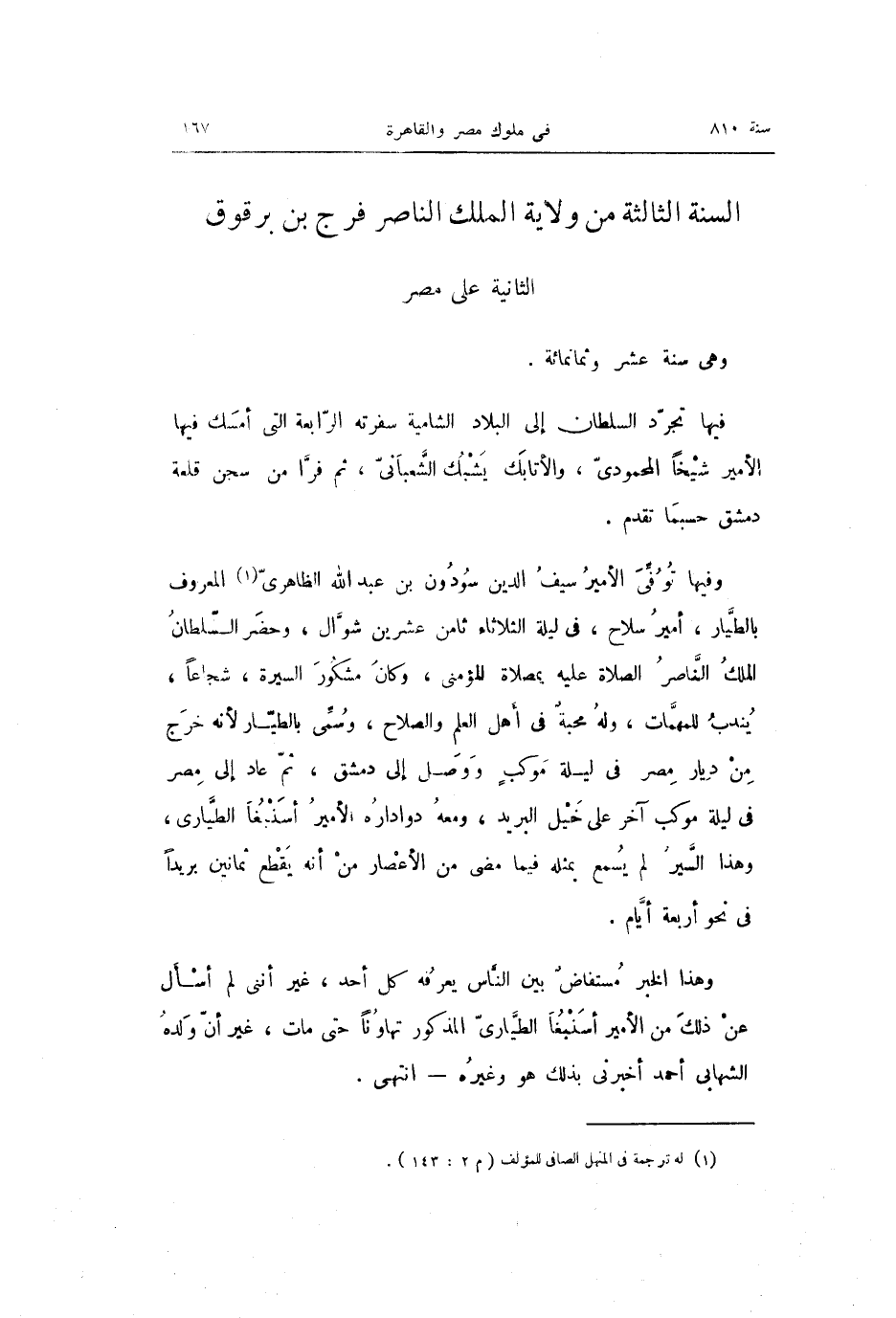 السنة الثالثة من ولاية الملك الناصر فرج بن برقوق الثانية على مصر وهى سنة عشر وثمانمائة.