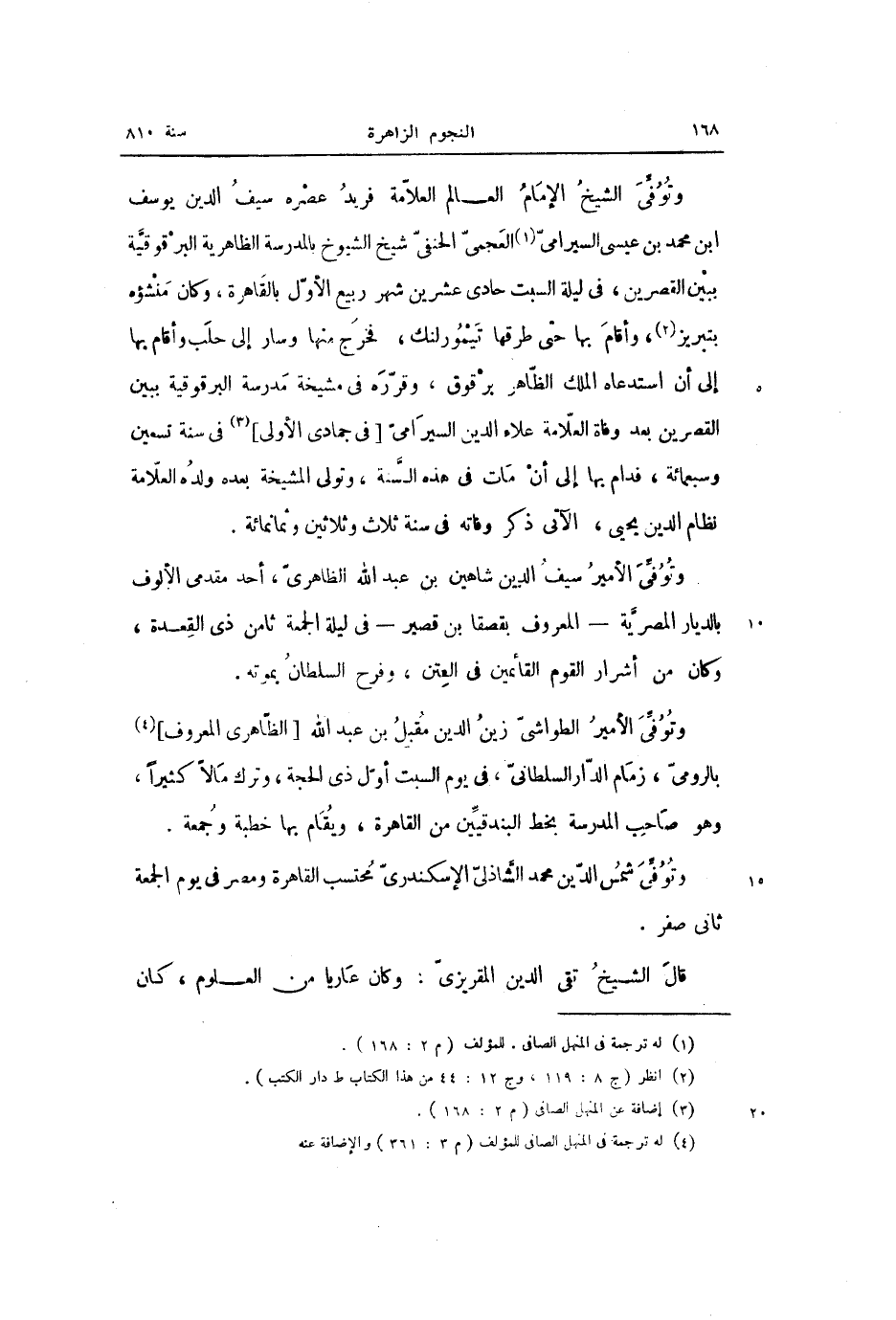 وتوفّى الشيخ الإمام العالم العلّامة فريد عصره سيف الدين يوسف ابن محمد بن عيسى السيرامىّ «1» العجمىّ الحنفىّ شيخ الشيوخ بالمدرسة الظاهرية البرقوقيّة ببين القصرين، فى ليلة السبت حادى عشرين شهر ربيع الأوّل بالقاهرة، وكان منشؤه بتبريز «2» ، وأقام بها حتى طرقها تيمورلنك، فخرج منها وسار إلى حلب وأقام بها إلى أن استدعاه الملك الظّاهر برقوق، وقرّره فى مشيخة مدرسة البرقوقية ببين القصرين بعد وفاة العلّامة علاء الدين السيرامىّ [فى جمادى الأولى] «3» فى سنة تسعين وسبعمائة، فدام بها إلى أن مات فى هذه السّنة، وتولى المشيخة بعده ولده العلّامة نظام الدين يحيى، الآتى ذكر وفاته فى سنة ثلاث وثلاثين وثمانمائة.