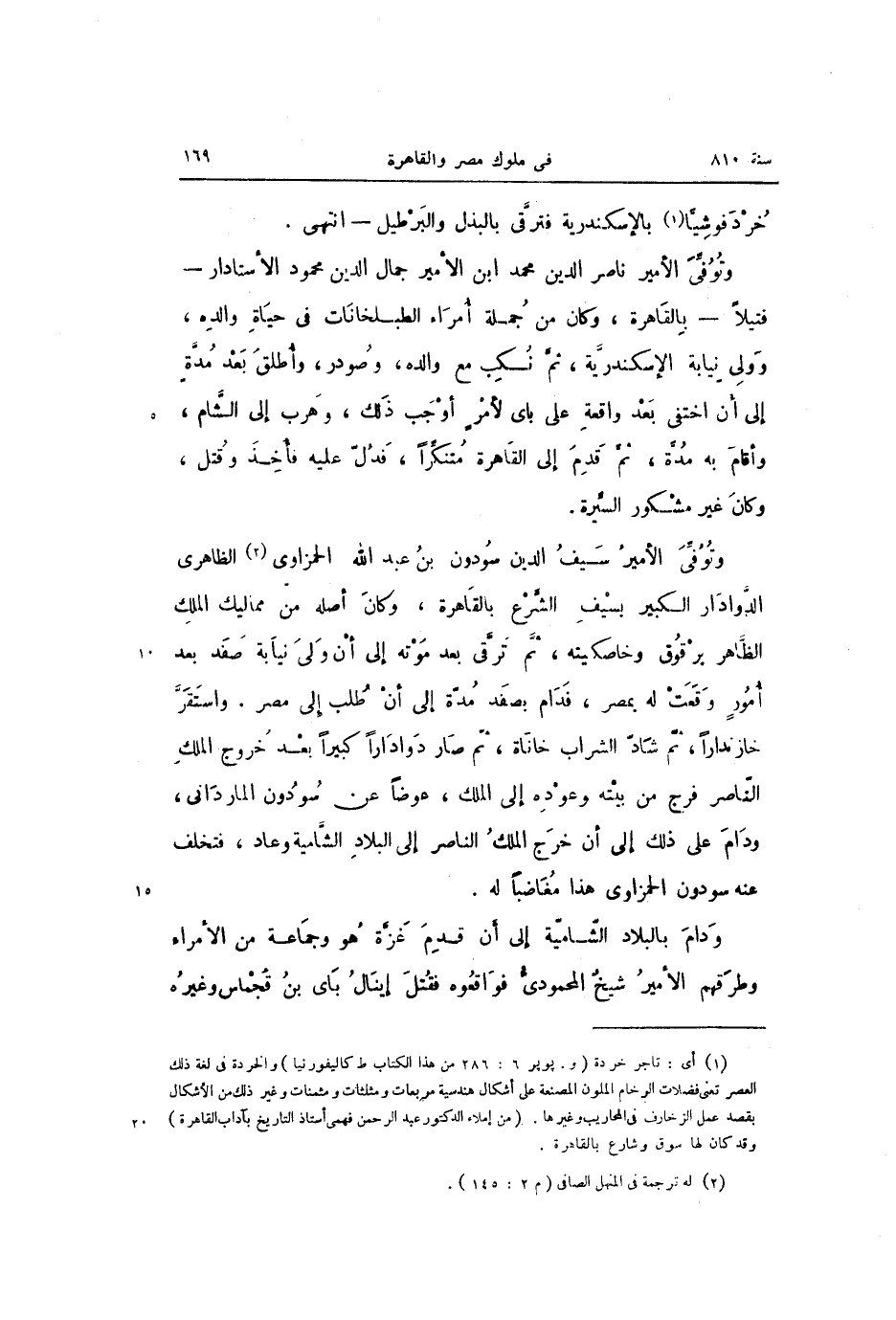 وتوفّى الأمير سيف الدين سودون بن عبد الله الحمزاوى «2» الظاهرى الدّوادار الكبير بسيف الشّرع بالقاهرة، وكان أصله من مماليك الملك الظّاهر برقوق وخاصكيته، ثمّ ترّقى بعد موته إلى أن ولى نيابة صفد بعد أمور وقعت له بمصر، فدام بصفد مدّة إلى أن طلب إلى مصر. واستقرّ خازندارا، ثمّ شادّ الشراب خاناة، ثمّ صار دوادارا كبيرا بعد خروج الملك النّاصر فرج من بيته وعوده إلى الملك، عوضا عن سودون الماردانى، ودام على ذلك إلى أن خرج الملك الناصر إلى البلاد الشّامية وعاد، فتخلف عنه سودون الحمزاوى هذا مغاضبا له.