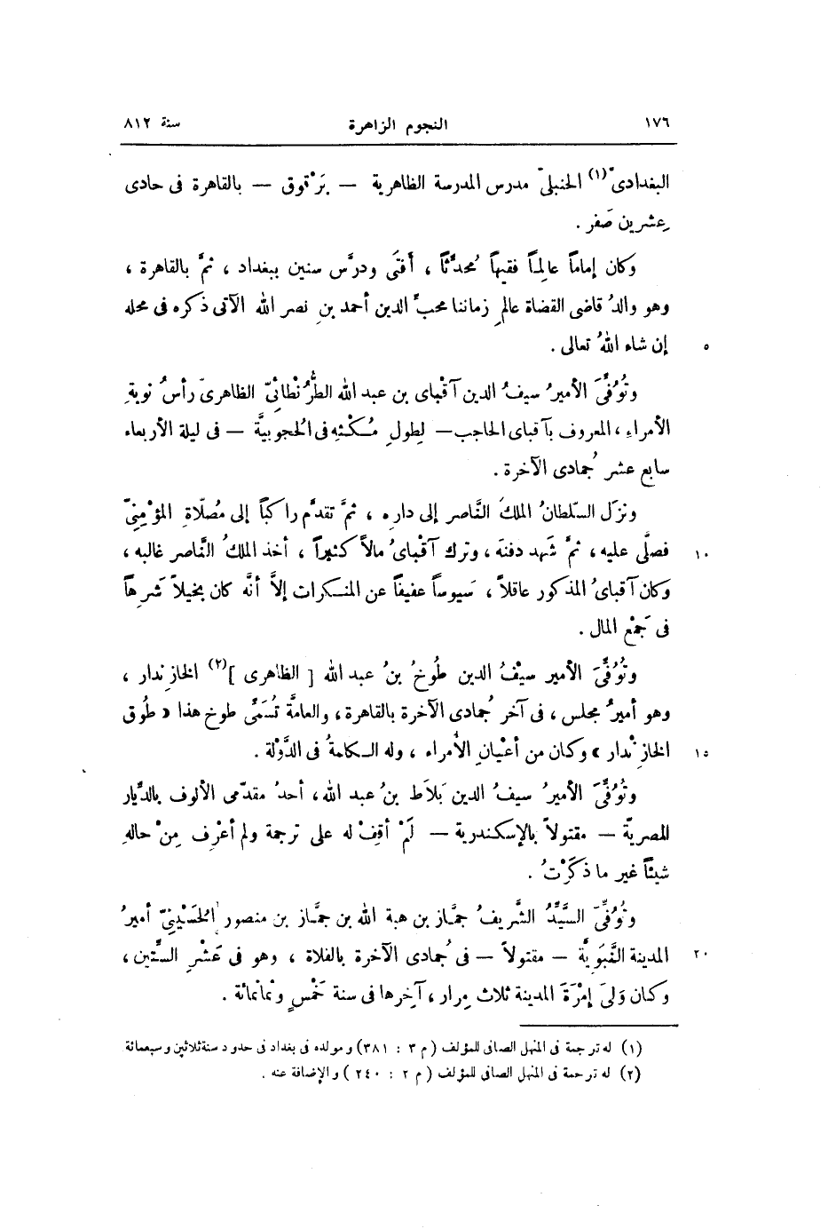 البغدادىّ «1» الحنبلىّ مدرس المدرسة الظاهرية- برقوق- بالقاهرة فى حادى عشرين صفر.