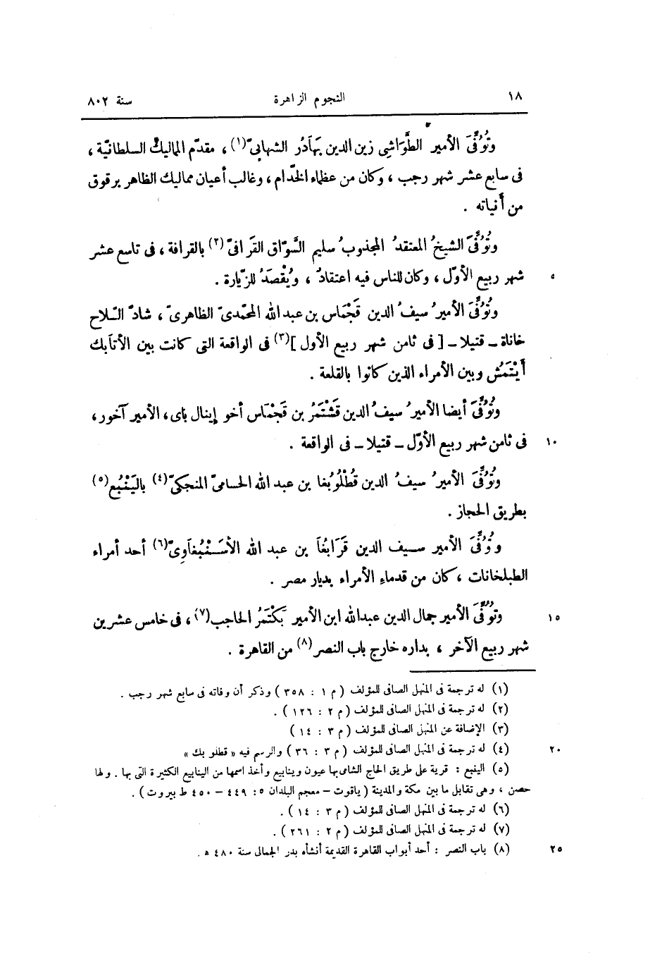 وتوفّى الأمير الطّواشى زين الدين بهادر الشهابىّ «1» ، مقدّم المماليك السلطانيّة، فى سابع عشر شهر رجب، وكان من عظماء الخدّام، وغالب أعيان مماليك الظاهر برقوق من أنياته.