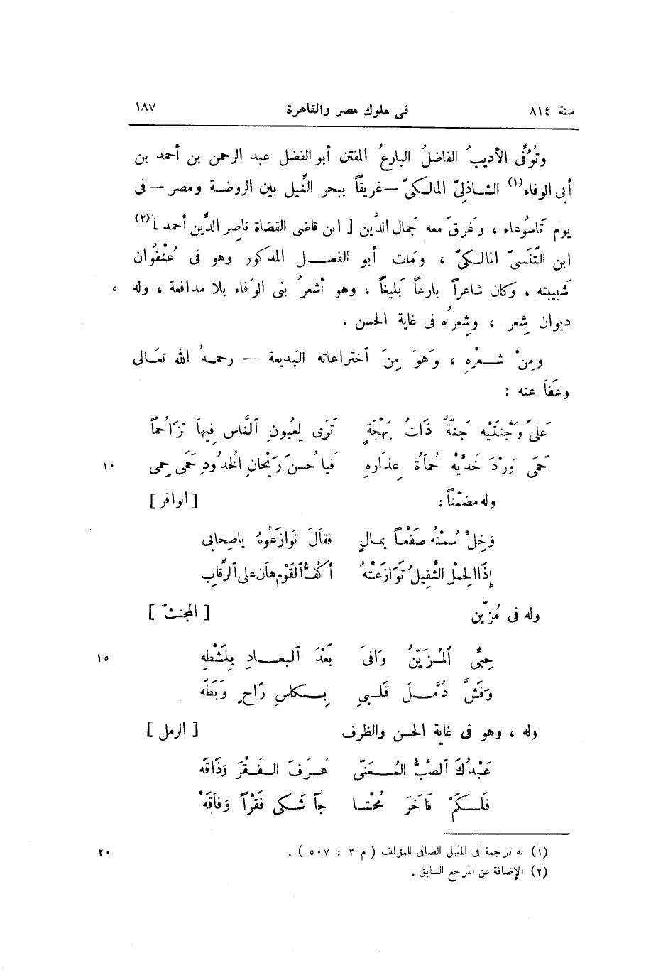 وتوفّى الأديب الفاضل البارع المفتن أبو الفضل عبد الرحمن بن أحمد بن أبى الوفاء «1» الشاذلىّ المالكىّ- غريقا ببحر النّيل بين الروضة ومصر- فى يوم تاسوعاء، وغرق معه جمال الدّين [ابن قاضى القضاة ناصر الدّين أحمد] «2» ابن التّنسىّ المالكىّ، ومات أبو الفضل المذكور وهو فى عنفوان شبيبته، وكان شاعرا بارعا بليغا، وهو أشعر بنى الوفاء بلا مدافعة، وله ديوان شعر، وشعره فى غاية الحسن.