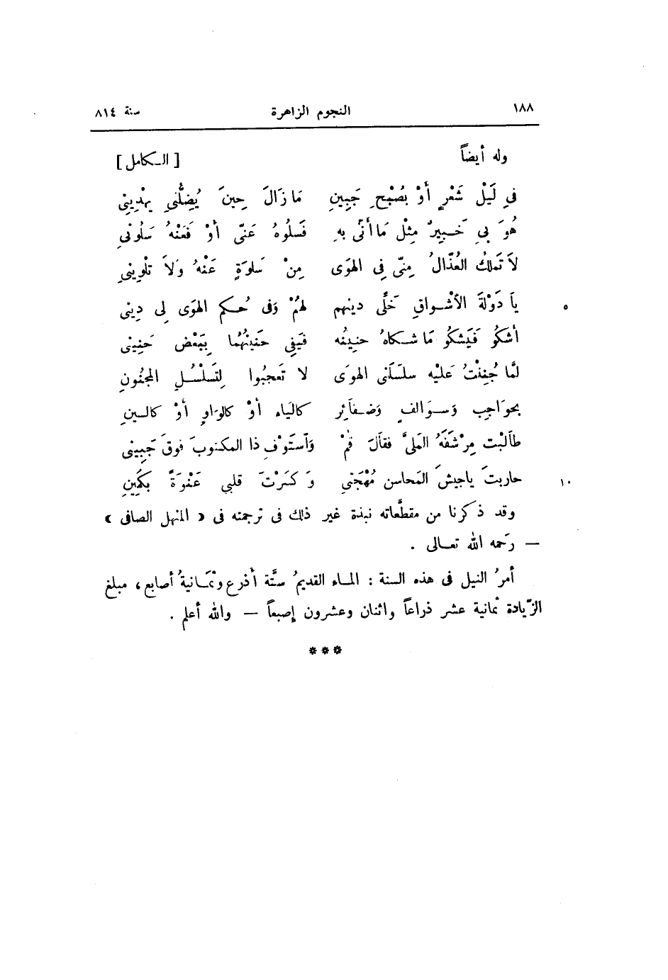 أمر النيل فى هذه السنة: الماء القديم ستّة أذرع وثمانية أصابع، مبلغ الزّيادة ثمانية عشر ذراعا واثنان وعشرون إصبعا- والله أعلم.