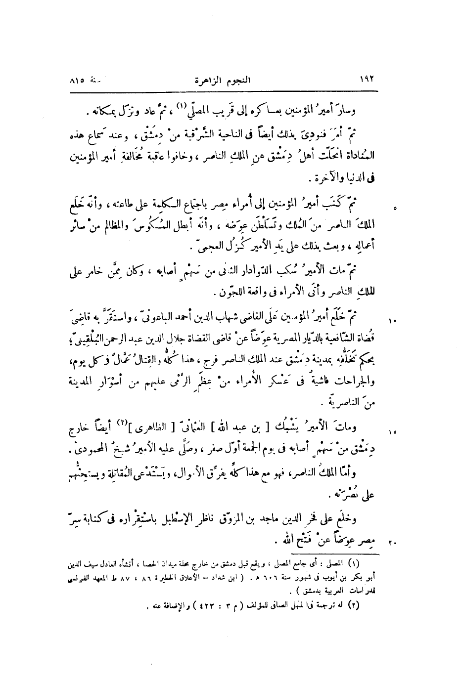 ثمّ خلع أمير المؤمنين على القاضى شهاب الدين أحمد الباعونىّ، واستقرّ به قاضى قضاة الشّافعية بالدّيار المصرية عوضا عن قاضى القضاة جلال الدين عبد الرحمن البلقينىّ؛ بحكم تخلّفه بمدينة دمشق عند الملك الناصر فرج، هذا كلّه والقتال عمّال فى كل يوم، والجراحات فاشية فى عسكر الأمراء من عظم الرّمى عليهم من أسوار المدينة من الناصريّة.