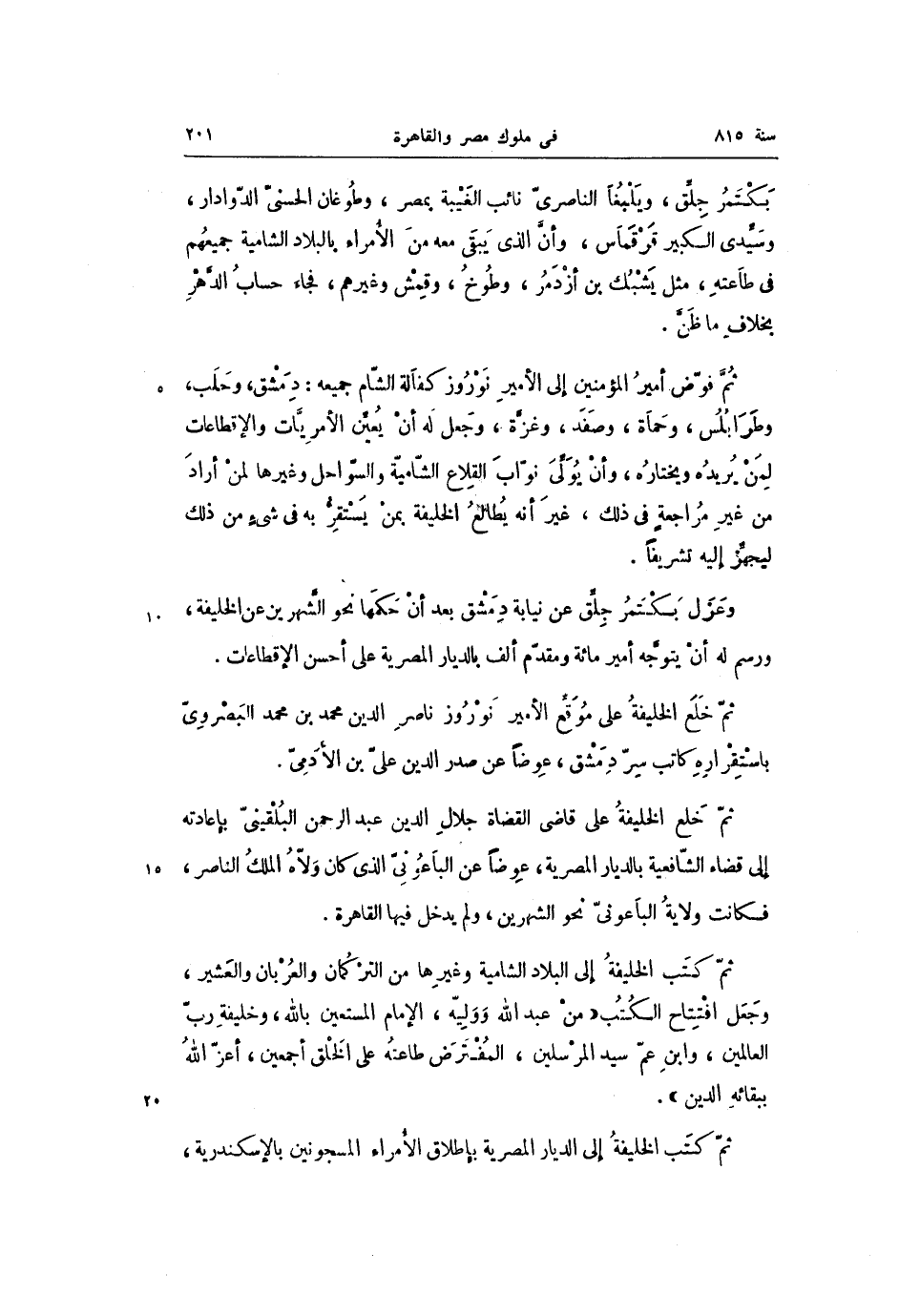 ثمّ فوّض أمير المؤمنين إلى الأمير نوروز كفالة الشّام جميعه: دمشق، وحلب، وطرابلس، وحماة، وصفد، وغزّة، وجعل له أن يعيّن الأمريّات والإقطاعات لمن يريده ويختاره، وأن يولّى نوّاب القلاع الشّاميّة والسّواحل وغيرها لمن أراد من غير مراجعة فى ذلك، غير أنه يطالع الخليفة بمن يستقرّ به فى شىء من ذلك ليجهّز إليه تشريفا.