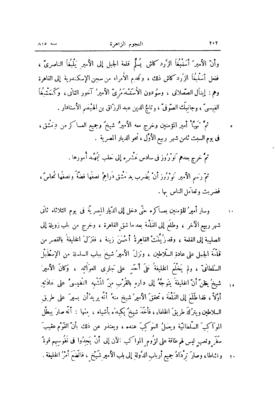 وسار أمير المؤمنين بعساكره حتّى دخل إلى الدّيار المصريّة فى يوم الثلاثاء ثانى شهر ربيع الآخر، وطلع إلى القلعة بعد ما شق القاهرة، وخرج من باب زويلة إلى الصليبة إلى القلعة، وقد زيّنت القاهرة أحسن زينة، فنزل الخليفة بالقصر من قلعة الجبل على عادة السّلاطين، ونزل الأمير شيخ بباب السلسلة من الإسطبل السّلطانىّ، ولم يخلع الخليفة على أحد على جارى العوائد، وكان الأمير شيخ يظنّ أنّ الخليفة يتوجّه إلى داره بالقرب من المشهد النفيسىّ على عادته أوّلا، فلما طلع إلى القلعة، تحقق الأمير شيخ منه أنّه يريد أن يسير على طريق السلاطين ويترك طريق الخلفاء، فأخذ شيخ يكيده بأشياء، منها: أنّه صار يبطّل المواكب السّلطانيّة ويعمل الموكب عنده، ويعتذر عن ذلك بأنّ القوم عقيب سفر وتعب ليس لهم طاقة على لزوم المواكب الآن إلى أن يجدوا فى نفوسهم قوة ونشاطا، وصار ترداد جميع أرباب الدّولة إلى باب الأمير شيخ، فاتّضع أمر الخليفة.