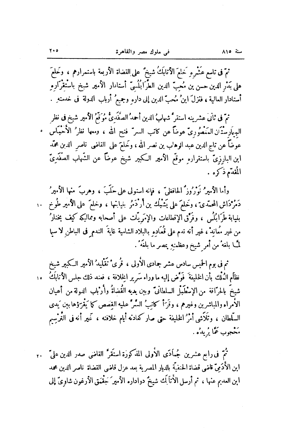 ثمّ فى تاسع عشره خلع الأتابك شيخ على القضاة الأربعة باستمرارهم، وخلع على بدر الدين حسن بن محبّ الدين الطّرابلسىّ أستادار الأمير شيخ باستقراره أستادار العالية، فنزل ابن محبّ الدين إلى داره وجميع أرباب الدولة فى خدمته.