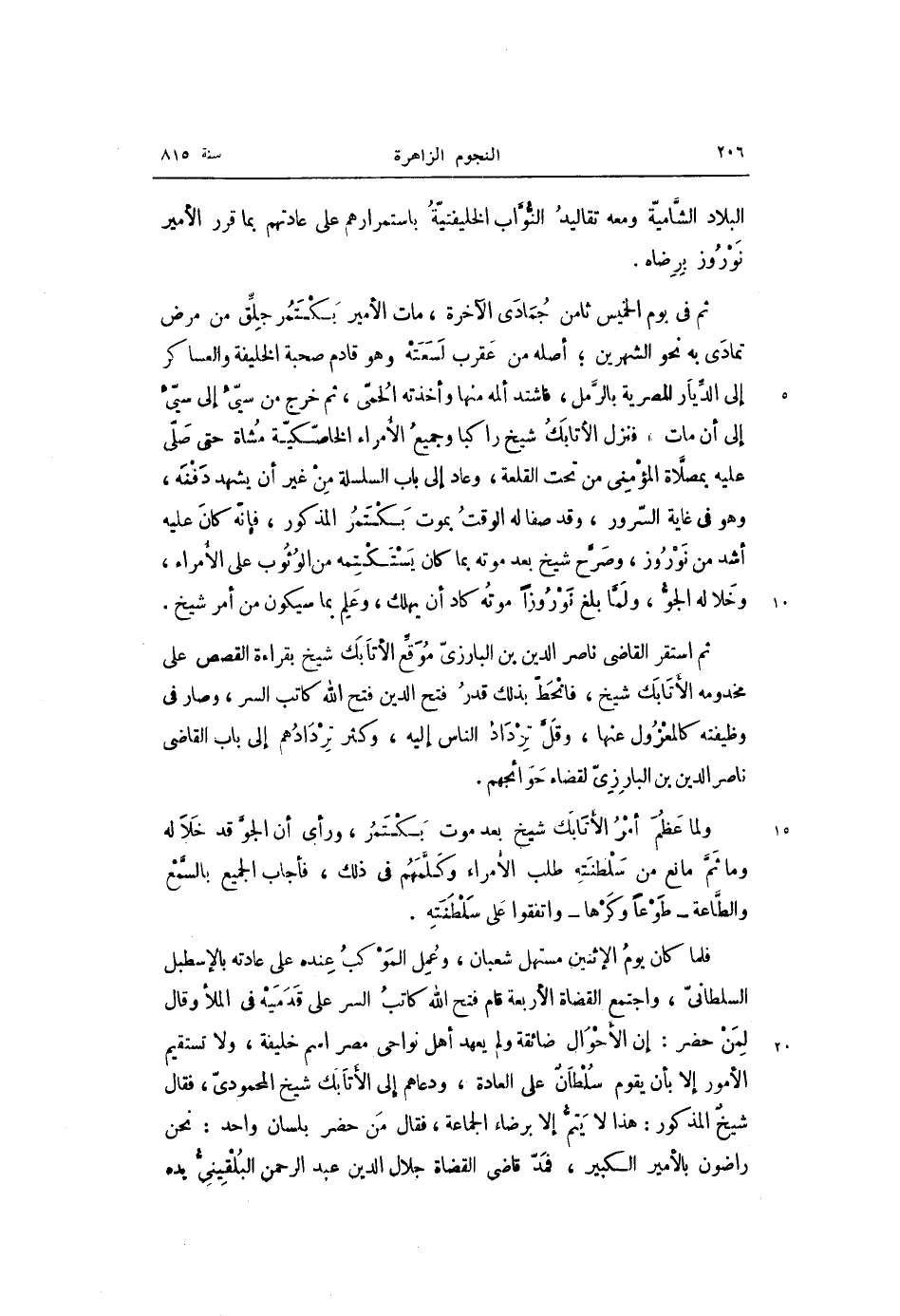 ثم استقر القاضى ناصر الدين بن البارزىّ موقّع الأتابك شيخ بقراءة القصص على مخدومه الأتابك شيخ، فانحطّ بذلك قدر فتح الدين فتح الله كاتب السر، وصار فى وظيفته كالمعزول عنها، وقلّ ترداد الناس إليه، وكثر تردادهم إلى باب القاضى ناصر الدين بن البارزىّ لقضاء حوائجهم.