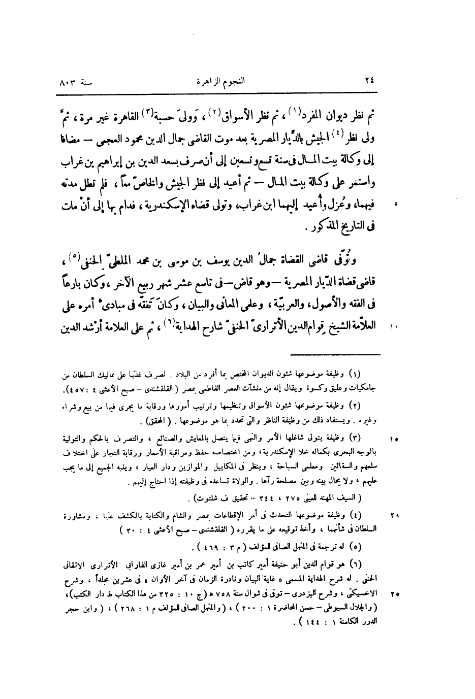 وتوفّى قاضى القضاة جمال الدين يوسف بن موسى بن محمد الملطىّ الحنفى «5» ، قاضى قضاة الدّيار المصرية- وهو قاض- فى تاسع عشر شهر ربيع الآخر، وكان بارعا فى الفقه والأصول، والعربيّة، وعلمى المعانى والبيان، وكان تفقّه فى مبادئ أمره على العلّامة الشيخ قوام الدين الأترارىّ الحنفىّ شارح الهداية «6» ، ثم على العلامة أرشد الدين