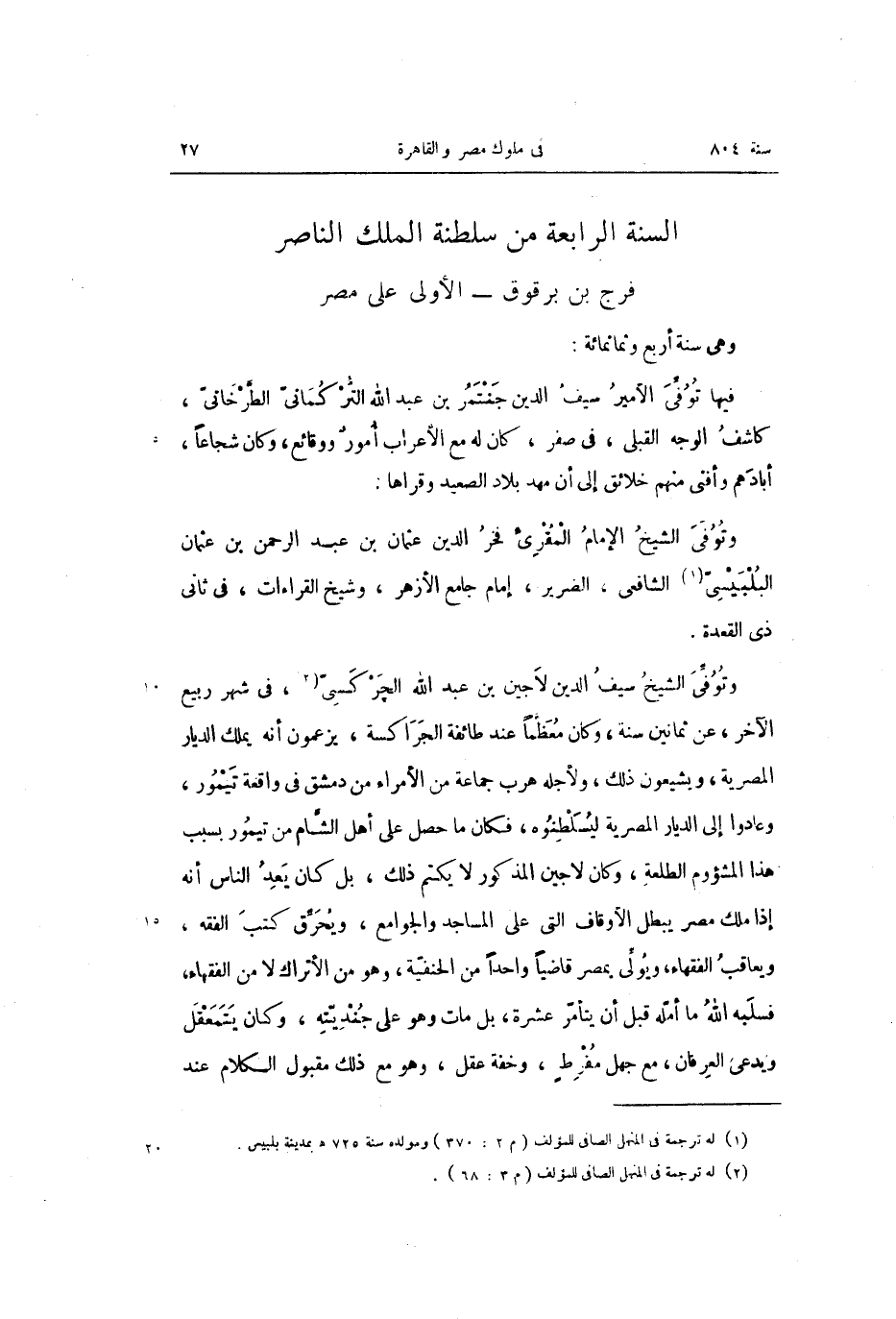 السنة الرابعة من سلطنة الملك الناصر فرج بن برقوق- الأولى على مصر وهى سنة أربع وثمانمائة: