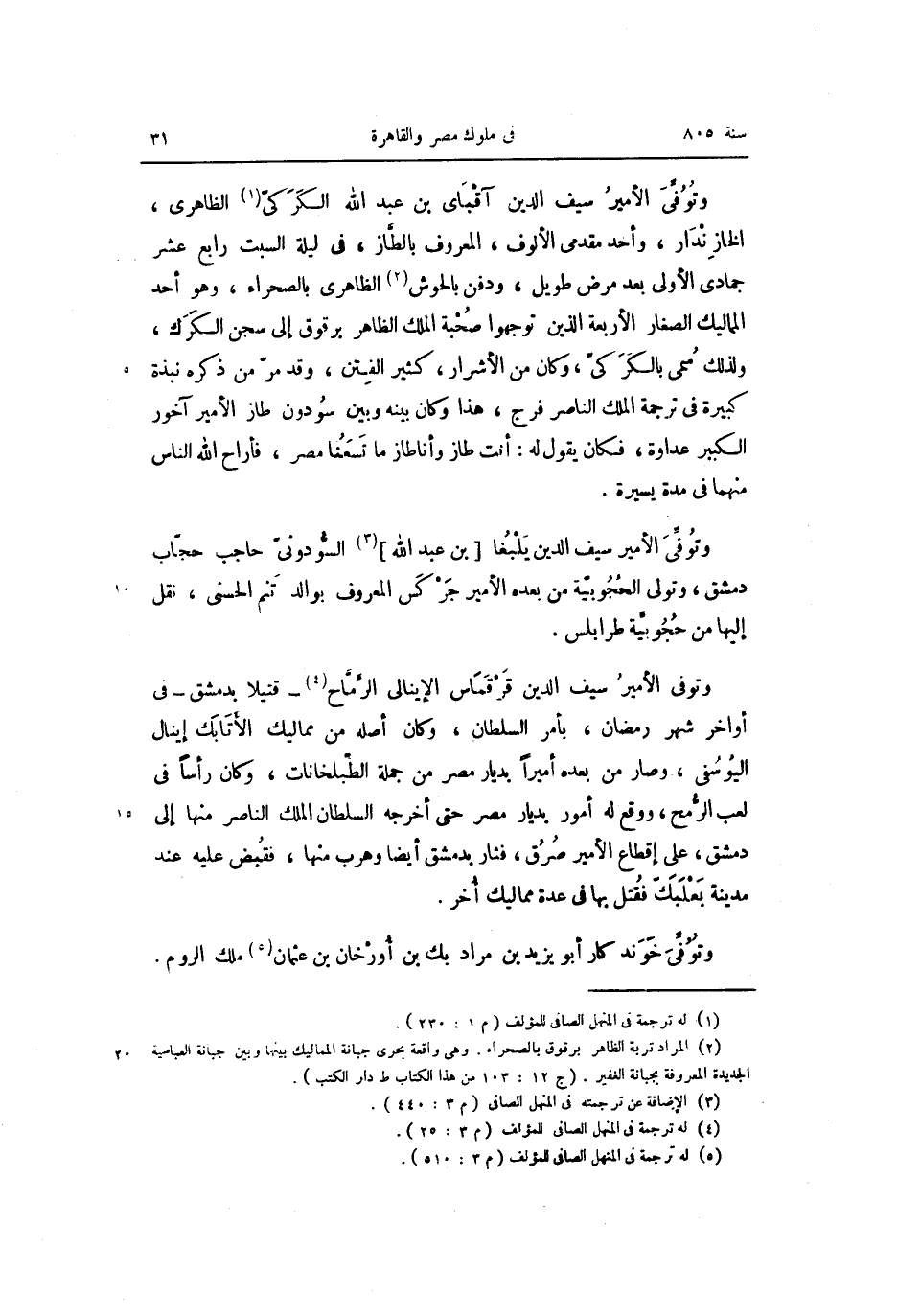 وتوفّى الأمير سيف الدين يلبغا [بن عبد الله] «3» السّودونىّ حاجب حجّاب دمشق، وتولى الحجوبيّة من بعده الأمير جركس المعروف بوالد تنم الحسنى، نقل إليها من حجوبيّة طرابلس.