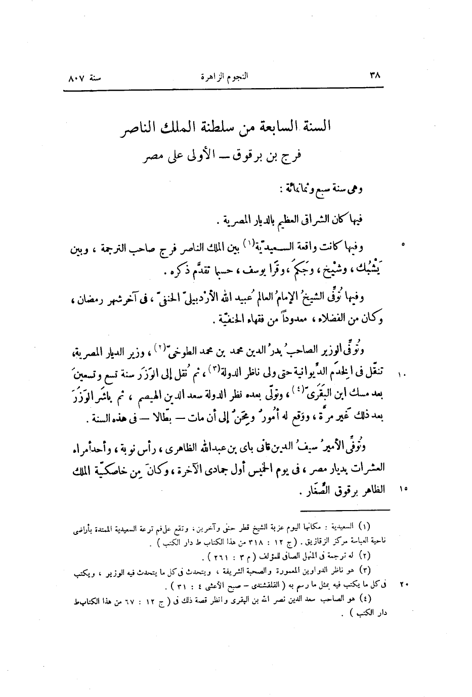 السنة السابعة من سلطنة الملك الناصر فرج بن برقوق- الأولى على مصر وهى سنة سبع وثمانمائة:
