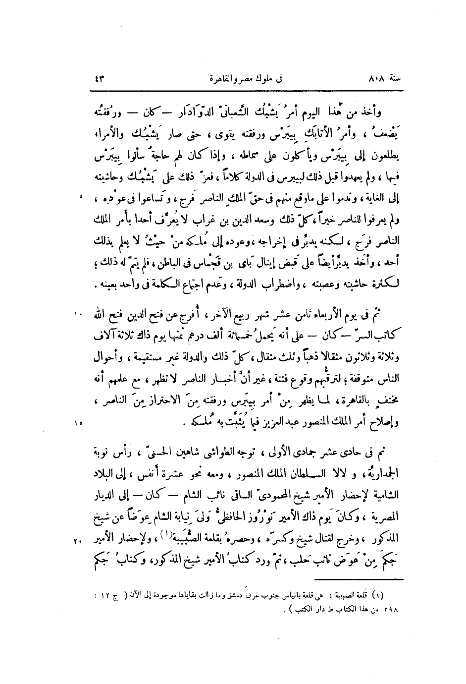 ثم فى حادى عشر جمادى الأولى، توجه الطواشى شاهين الحسنىّ، رأس نوبة الجمداريّة، ولالا السلطان الملك المنصور، ومعه نحو عشرة أنفس، إلى البلاد الشامية لإحضار الأمير شيخ المحمودىّ الساقى نائب الشام- كان- إلى الديار المصرية، وكان يوم ذاك الأمير نوروز الحافظىّ ولى نيابة الشام عوضا عن شيخ المذكور، وخرج لقتال شيخ وكسره، وحصره بقلعة الصّبيبة «1» ، ولإحضار الأمير جكم من عوض نائب حلب، ثمّ ورد كتاب الأمير شيخ المذكور، وكتاب جكم