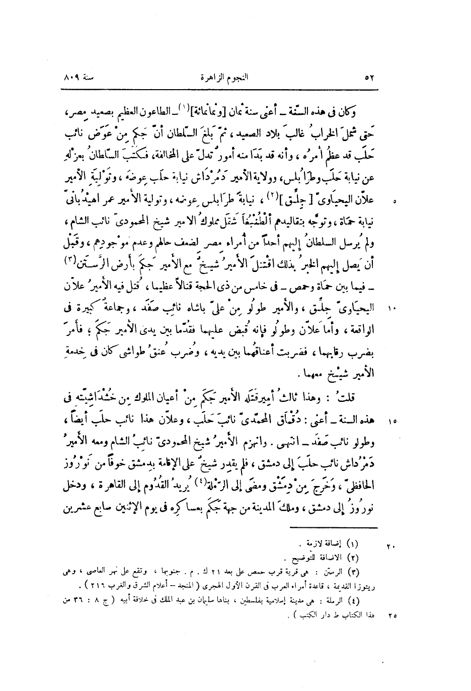 وكان فى هذه السّنة- أعنى سنة ثمان [وثمانمائة] «1» - الطاعون العظيم بصعيد مصر، حتى شمل الخراب غالب بلاد الصعيد، ثمّ بلغ السّلطان أنّ جكم من عوض نائب حلب قد عظم أمره، وأنه قد بدا منه أمور تدلّ على المخالفة، فكتب السّلطان بعزله عن نيابة حلب وطرابلس، وولاية الأمير دمرداش نيابة حلب عوضه، وتولية الأمير علّان اليحياوىّ [جلّق] «2» ، نيابة طرابلس عوضه، وتولية الأمير عمر الهيدبانىّ نيابة حماة، وتوجّه بتقاليدهم ألطنبغا شقل مملوك الأمير شيخ المحمودىّ نائب الشام، ولم يرسل السلطان إليهم أحدا من أمراء مصر لضعف حالهم وعدم موجودهم، وقبل أن يصل إليهم الخبر بذلك اقتتل الأمير شيخ مع الأمير جكم بأرض الرّستن «3» - فيما بين حماة وحمص- فى خامس من ذى الحجة قتالا عظيما، قتل فيه الأمير علّان اليحياوىّ جلّق، والأمير طولو من علىّ باشاه نائب صفد، وجماعة كبيرة فى الواقعة، وأما علّان وطولو فإنه قبض عليهما فقدّما بين يدى الأمير جكم؛ فأمر بضرب رقابهما، فضربت أعناقهما بين يديه، وضرب عنق طواشى كان فى خدمة الأمير شيخ معهما.