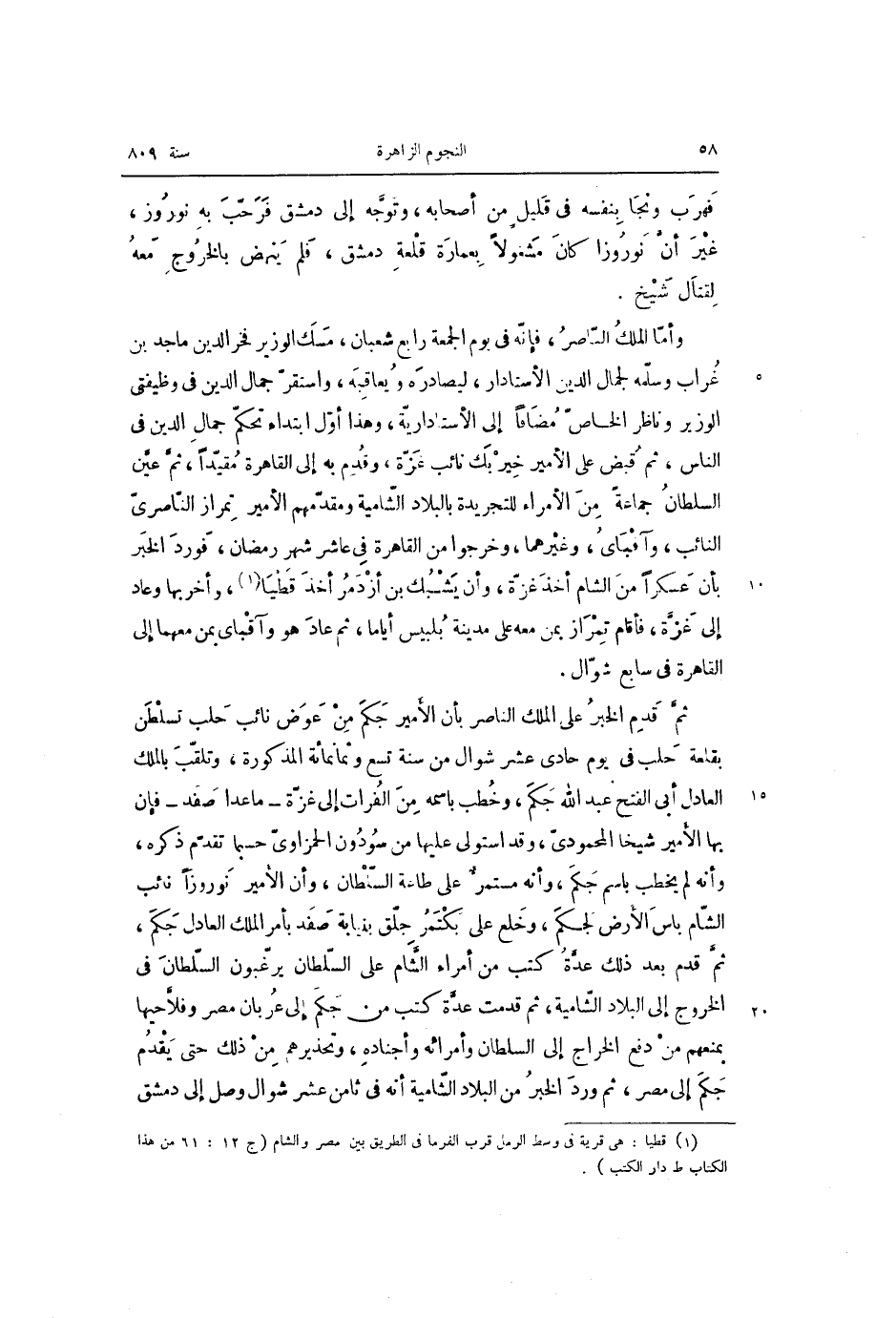 ثمّ قدم الخبر على الملك الناصر بأن الأمير جكم من عوض نائب حلب تسلطن بقلعة حلب فى يوم حادى عشر شوال من سنة تسع وثمانمائة المذكورة، وتلقّب بالملك العادل أبى الفتح عبد الله جكم، وخطب باسمه من الفرات إلى غزّة- ما عدا صفد- فإن بها الأمير شيخا المحمودىّ، وقد استولى عليها من سودون الحمزاوىّ حسبما تقدّم ذكره، وأنه لم يخطب باسم جكم، وأنه مستمرّ على طاعة السّلطان، وأن الأمير نوروزا نائب الشّام باس الأرض لجكم، وخلع على بكتمر جلّق بنيابة صفد بأمر الملك العادل جكم، ثمّ قدم بعد ذلك عدّة كتب من أمراء الشّام على السّلطان يرغّبون السّلطان فى الخروج إلى البلاد الشّامية، ثم قدمت عدّة كتب من جكم إلى عربان مصر وفلّاحيها بمنعهم من دفع الخراج إلى السلطان وأمرائه وأجناده، وتحذيرهم من ذلك حتى يقدم جكم إلى مصر، ثم ورد الخبر من البلاد الشّامية أنه فى ثامن عشر شوال وصل إلى دمشق