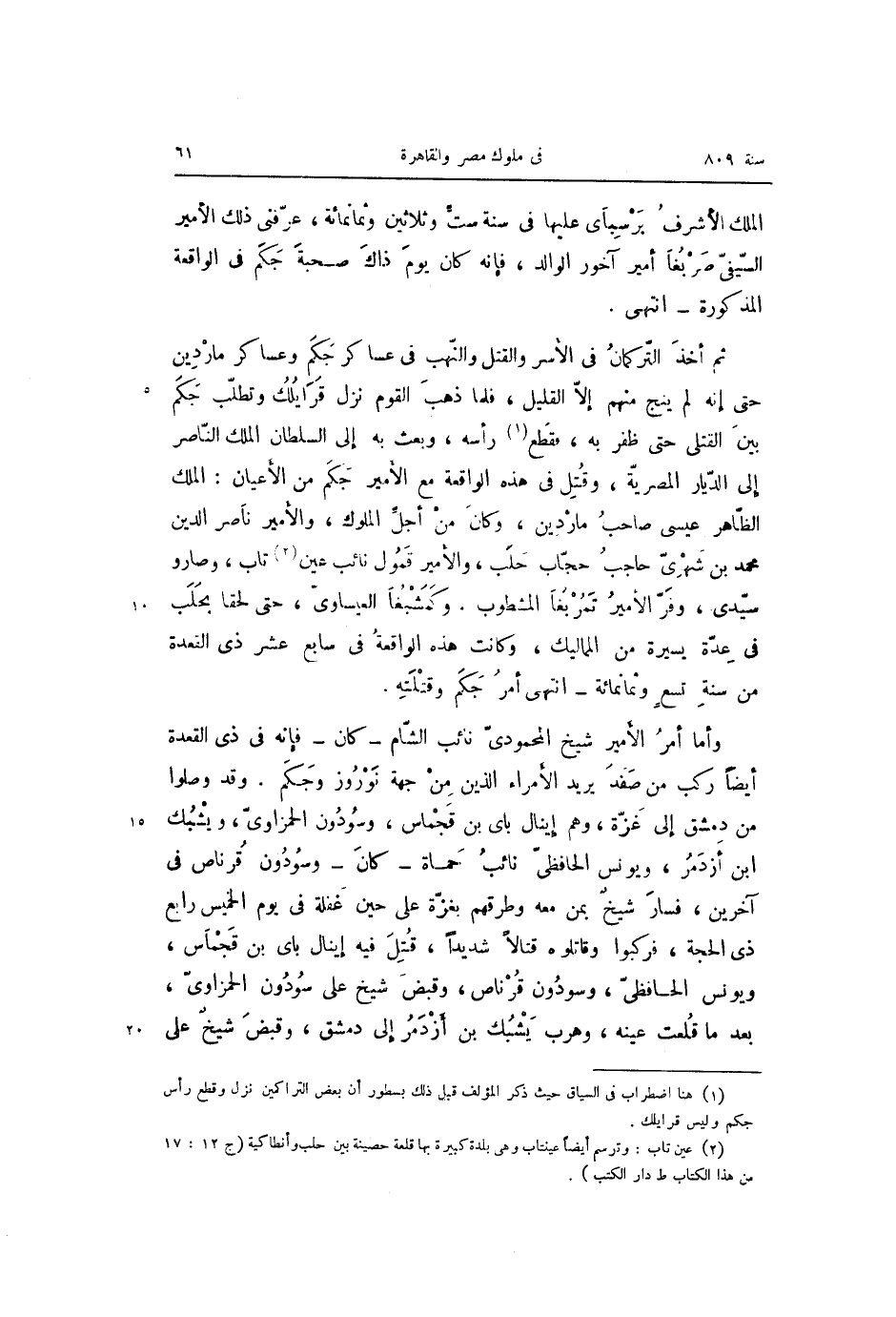 ثم أخذ التّركمان فى الأسر والقتل والنّهب فى عساكر جكم وعساكر ماردين حتى إنه لم ينج منهم إلّا القليل، فلما ذهب القوم نزل قرايلك وتطلّب جكم بين القتلى حتى ظفر به، فقطع «1» رأسه، وبعث به إلى السلطان الملك النّاصر إلى الدّيار المصريّة، وقتل فى هذه الواقعة مع الأمير جكم من الأعيان: الملك الظّاهر عيسى صاحب ماردين، وكان من أجلّ الملوك، والأمير ناصر الدين محمد بن شهرىّ حاجب حجّاب حلب، والأمير قمول نائب عين «2» تاب، وصارو سيّدى، وفرّ الأمير تمربغا المشطوب. وكمشبغا العيساوىّ، حتى لحقا بحلب فى عدّة يسيرة من المماليك، وكانت هذه الواقعة فى سابع عشر ذى القعدة من سنة تسع وثمانمائة- انتهى أمر جكم وقتلته.